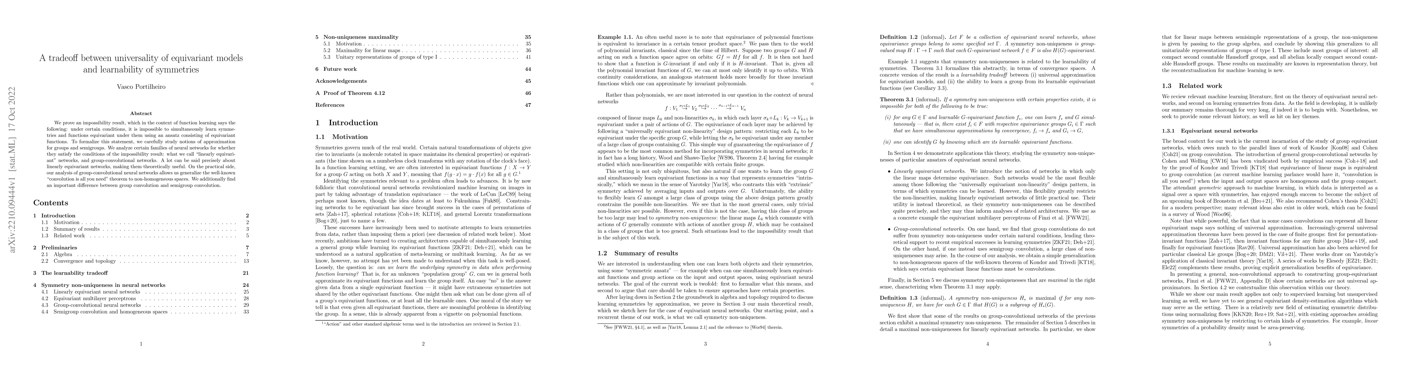 This paper presents an impossibility result showing that it is not feasible to simultaneously learn symmetries and equivariant functions using equivariant models under certain conditions. It analyzes "linearly equivariant" networks and group-convolutional networks, extending the "convolution is all you need" theorem to non-homogeneous spaces.
