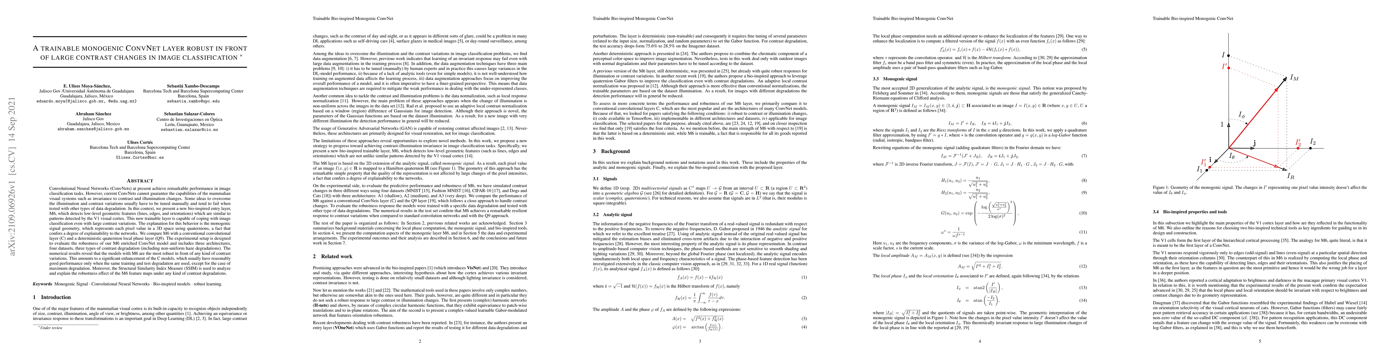 Convolutional Neural Networks (ConvNets) at present achieve remarkable performance in image classification tasks. However, current ConvNets cannot guarantee the capabilities of the mammalian visual systems such as invariance to contrast and illumination changes. Some ideas to overcome the illumination and contrast variations usually have to be tuned manually and tend to fail when tested with other types of data degradation. In this context, we present a new bio-inspired {entry} layer, M6, which detects low-level geometric features (lines, edges, and orientations) which are similar to patterns detected by the V1 visual cortex. This new trainable layer is capable of coping with image classification even with large contrast variations. The explanation for this behavior is the monogenic signal geometry, which represents each pixel value in a 3D space using quaternions, a fact that confers a degree of explainability to the networks. We compare M6 with a conventional convolutional layer (C) and a deterministic quaternion local phase layer (Q9). The experimental setup {is designed to evaluate the robustness} of our M6 enriched ConvNet model and includes three architectures, four datasets, three types of contrast degradation (including non-uniform haze degradations). The numerical results reveal that the models with M6 are the most robust in front of any kind of contrast variations. This amounts to a significant enhancement of the C models, which usually have reasonably good performance only when the same training and test degradation are used, except for the case of maximum degradation. Moreover, the Structural Similarity Index Measure (SSIM) is used to analyze and explain the robustness effect of the M6 feature maps under any kind of contrast degradations.