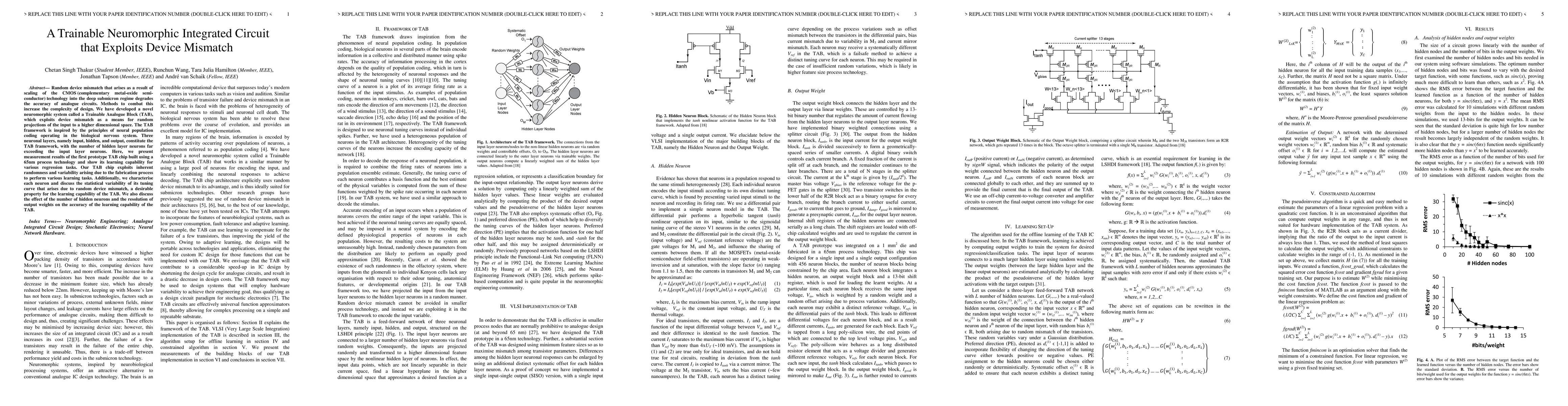 Random device mismatch that arises as a result of scaling of the CMOS (complementary metal-oxide semi-conductor) technology into the deep submicron regime degrades the accuracy of analogue circuits. Methods to combat this increase the complexity of design. We have developed a novel neuromorphic system called a Trainable Analogue Block (TAB), which exploits device mismatch as a means for random projections of the input to a higher dimensional space. The TAB framework is inspired by the principles of neural population coding operating in the biological nervous system. Three neuronal layers, namely input, hidden, and output, constitute the TAB framework, with the number of hidden layer neurons far exceeding the input layer neurons. Here, we present measurement results of the first prototype TAB chip built using a 65nm process technology and show its learning capability for various regression tasks. Our TAB chip exploits inherent randomness and variability arising due to the fabrication process to perform various learning tasks. Additionally, we characterise each neuron and discuss the statistical variability of its tuning curve that arises due to random device mismatch, a desirable property for the learning capability of the TAB. We also discuss the effect of the number of hidden neurons and the resolution of output weights on the accuracy of the learning capability of the TAB.