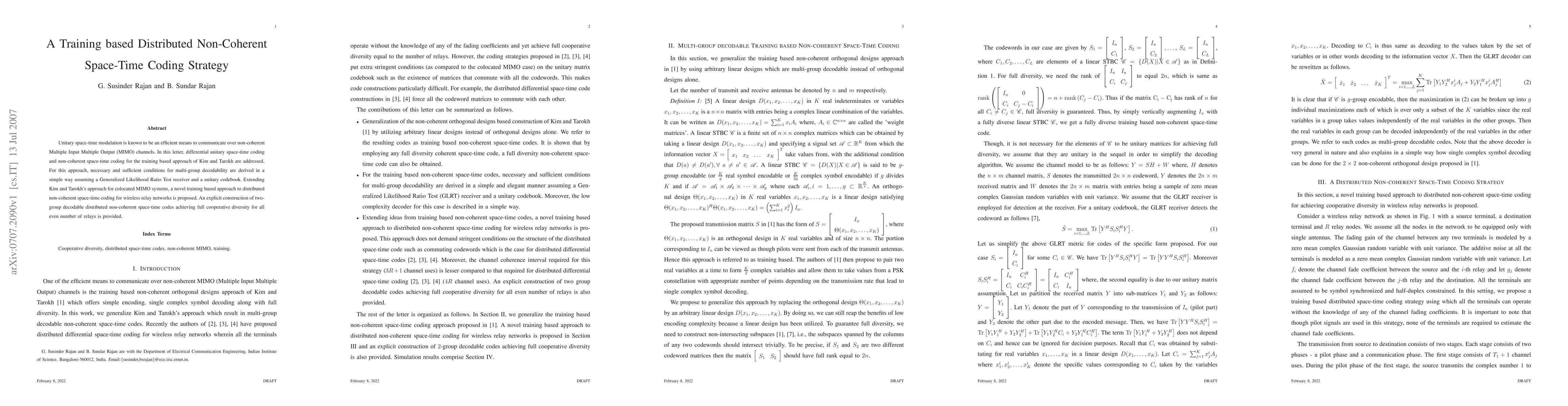 This paper proposes a training-based distributed non-coherent space-time coding strategy for wireless relay networks, extending Kim and Tarokh's approach. It provides necessary and sufficient conditions for multi-group decodability and constructs two-group decodable codes achieving full cooperative diversity for even relay counts.