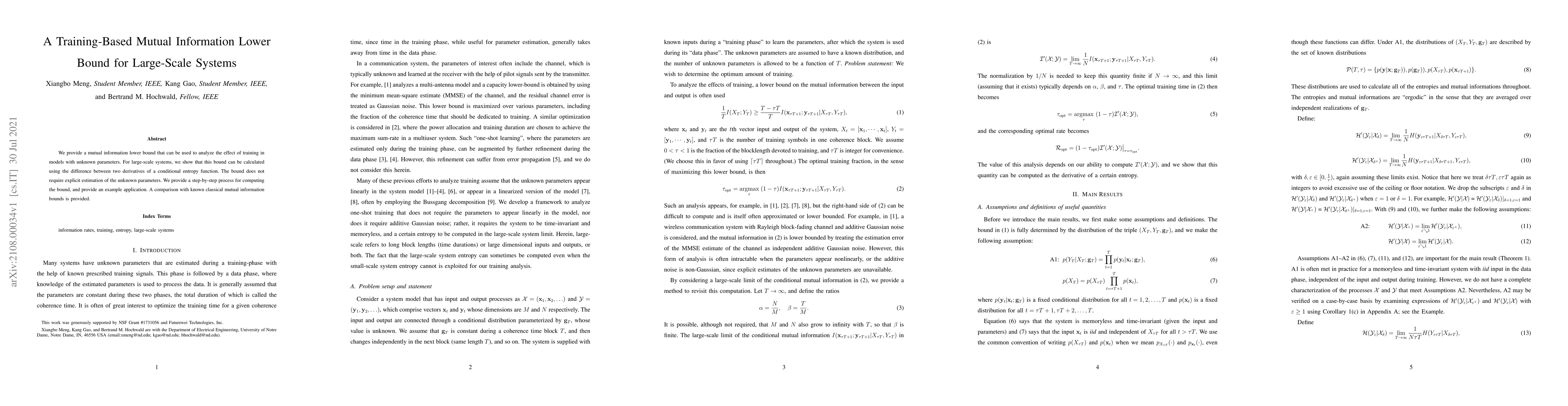 Researchers developed a method to analyze the impact of training in large-scale systems using a mutual information lower bound that doesn't require estimating unknown parameters. This bound can help improve model performance by providing a quantitative measure of uncertainty.