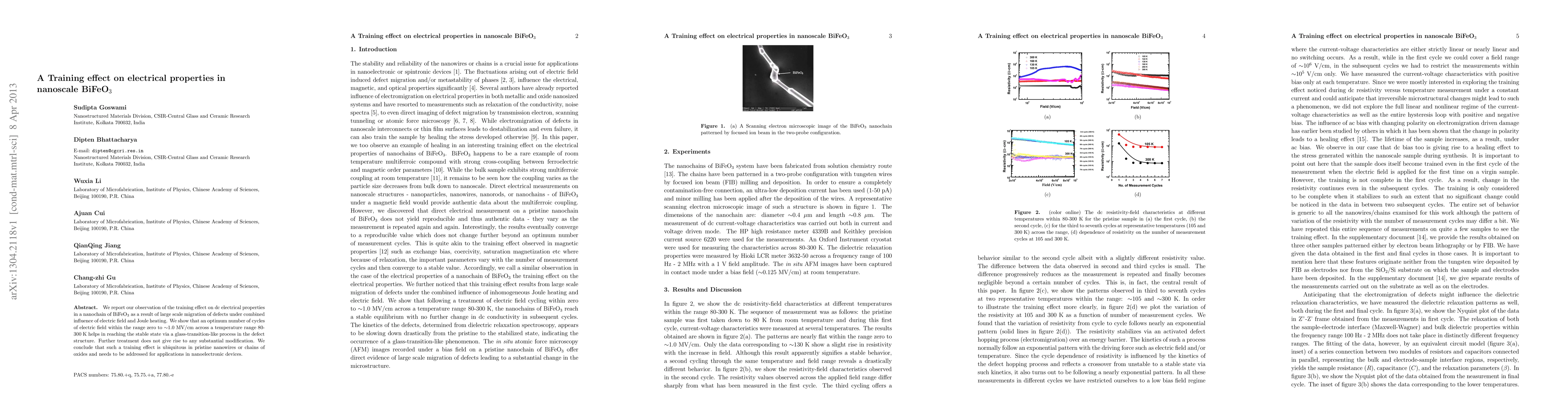 We report our observation of the training effect on dc electrical properties in a nanochain of BiFeO$_3$ as a result of large scale migration of defects under combined influence of electric field and Joule heating. We show that an optimum number of cycles of electric field within the range zero to $\sim$1.0 MV/cm across a temperature range 80-300 K helps in reaching the stable state via a glass-transition-like process in the defect structure. Further treatment does not give rise to any substantial modification. We conclude that such a training effect is ubiquitous in pristine nanowires or chains of oxides and needs to be addressed for applications in nanoelectronic devices.