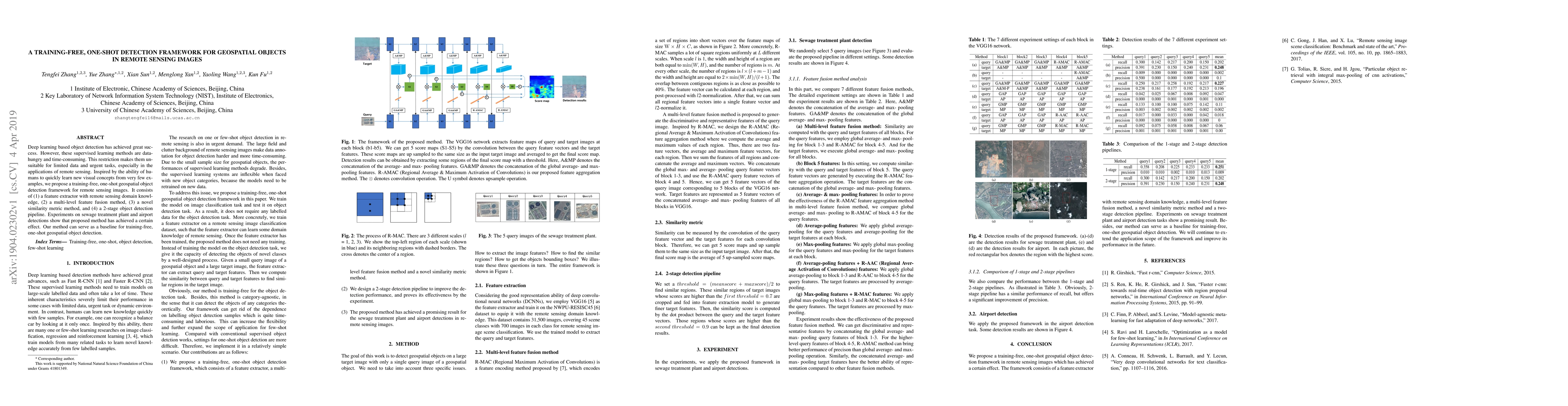 This paper proposes a training-free, one-shot detection framework for geospatial objects in remote sensing images, utilizing a feature extractor with domain knowledge, multi-level feature fusion, a novel similarity metric, and a 2-stage detection pipeline. Experiments demonstrate its effectiveness for detecting sewage treatment plants and airports with limited examples.