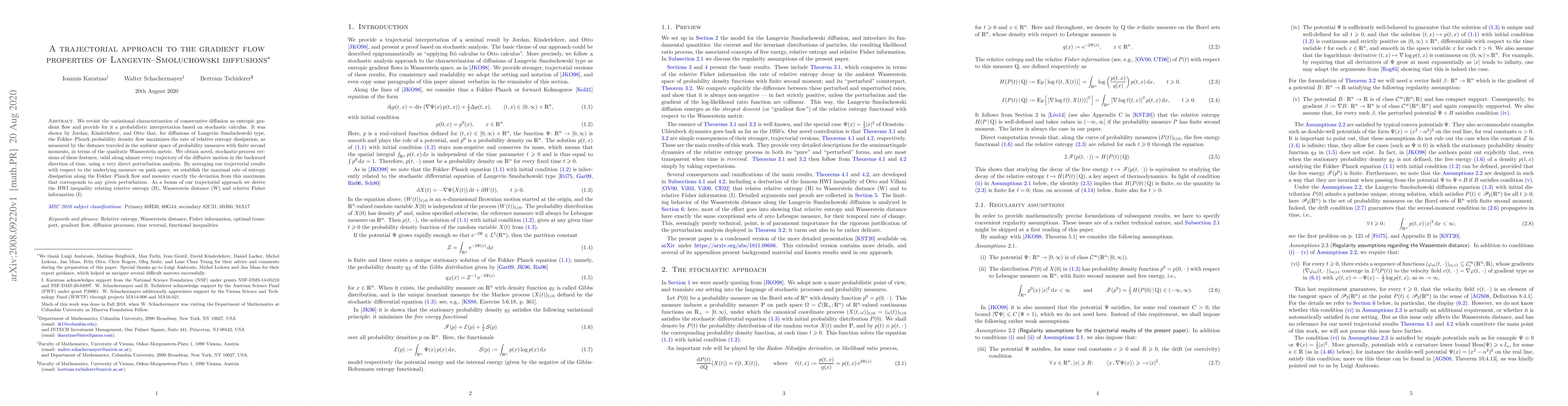 This paper revisits the variational characterization of Langevin-Smoluchowski diffusions as entropic gradient flows, providing a probabilistic interpretation via stochastic calculus. It establishes trajectorial properties of the Fokker-Planck flow, revealing the maximal rate of entropy dissipation and deriving the HWI inequality.