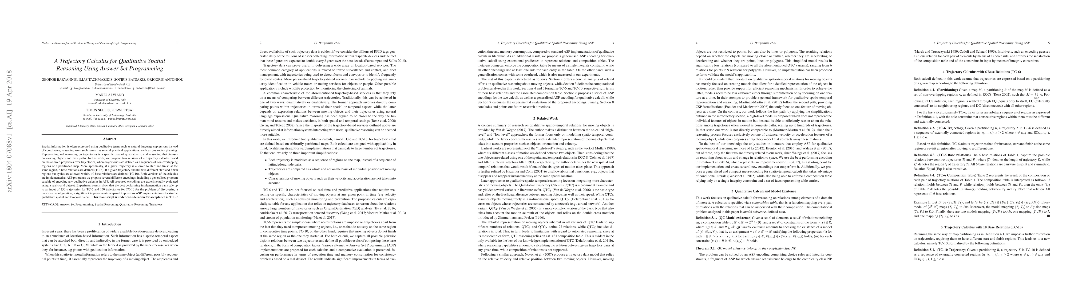 Spatial information is often expressed using qualitative terms such as natural language expressions instead of coordinates; reasoning over such terms has several practical applications, such as bus routes planning. Representing and reasoning on trajectories is a specific case of qualitative spatial reasoning that focuses on moving objects and their paths. In this work, we propose two versions of a trajectory calculus based on the allowed properties over trajectories, where trajectories are defined as a sequence of non-overlapping regions of a partitioned map. More specifically, if a given trajectory is allowed to start and finish at the same region, 6 base relations are defined (TC-6). If a given trajectory should have different start and finish regions but cycles are allowed within, 10 base relations are defined (TC-10). Both versions of the calculus are implemented as ASP programs; we propose several different encodings, including a generalised program capable of encoding any qualitative calculus in ASP. All proposed encodings are experimentally evaluated using a real-world dataset. Experiment results show that the best performing implementation can scale up to an input of 250 trajectories for TC-6 and 150 trajectories for TC-10 for the problem of discovering a consistent configuration, a significant improvement compared to previous ASP implementations for similar qualitative spatial and temporal calculi. This manuscript is under consideration for acceptance in TPLP.