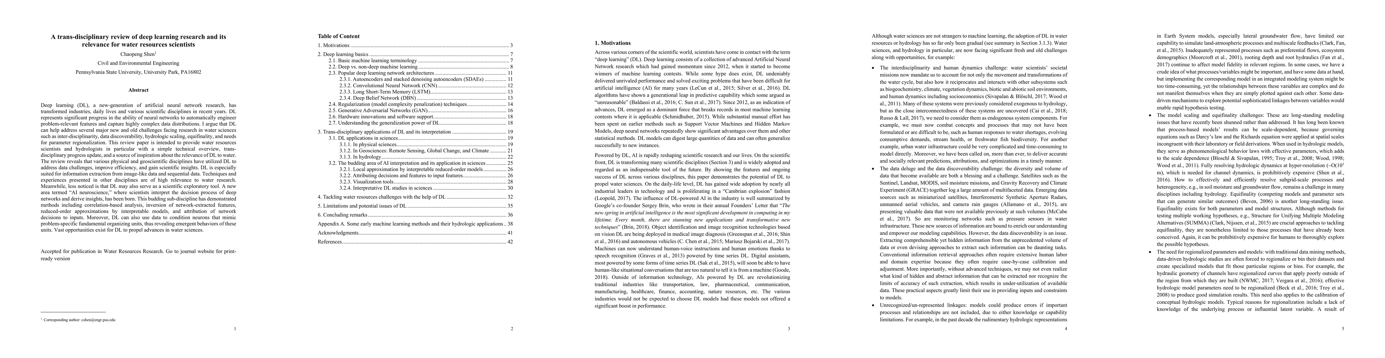 A review of deep learning research shows its potential to address challenges in water sciences such as data discovery and scaling, offering opportunities for advancing hydrology and water resources.