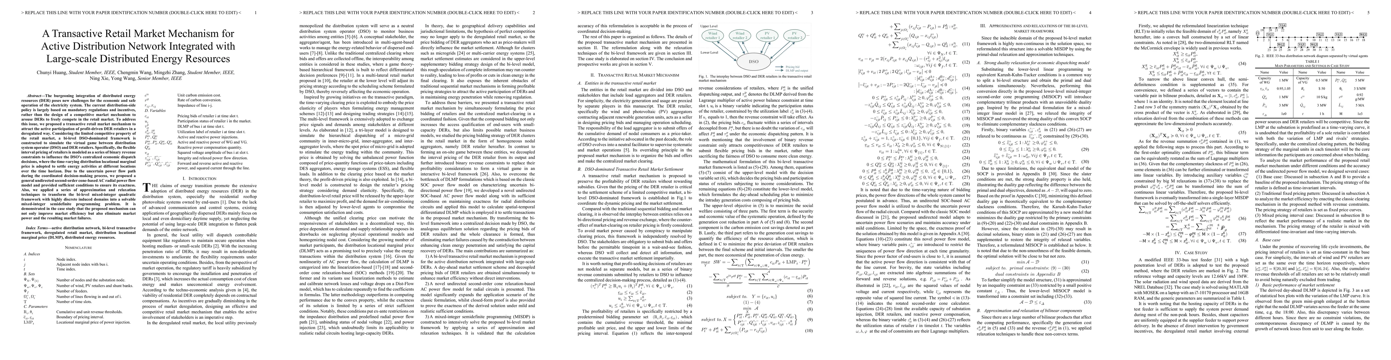 The paper proposes a transactive retail market mechanism to integrate distributed energy resources (DER) into active distribution networks, employing a bi-level framework to optimize economic dispatch and mitigate market power. The mechanism uses flexible interval pricing and a second-order cone-based AC radial power flow model to enhance market efficiency and address uncertainties.