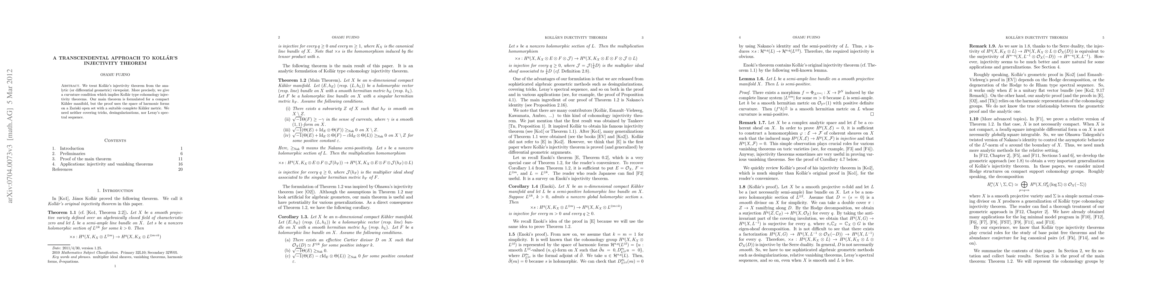 This paper presents a novel analytic approach to Kollár's injectivity theorem using curvature conditions on a compact Kähler manifold, leveraging the space of harmonic forms without resorting to covering tricks, desingularizations, or spectral sequences.