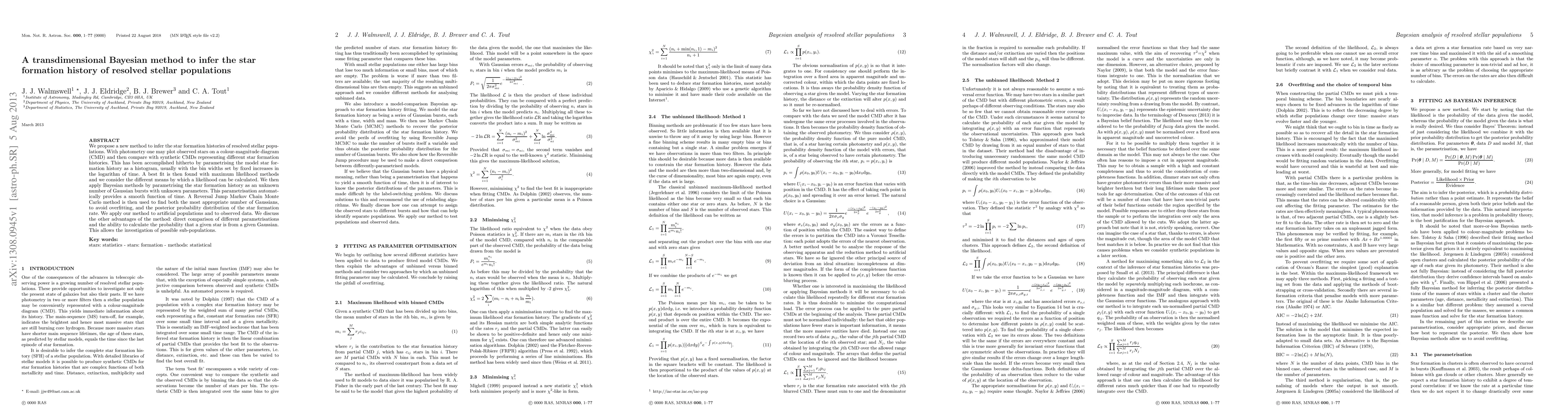 We propose a new method to infer the star formation histories of resolved stellar populations. With photometry one may plot observed stars on a colour-magnitude diagram (CMD) and then compare with synthetic CMDs representing different star formation histories. This has been accomplished hitherto by parametrising the model star formation history as a histogram, usually with the bin widths set by fixed increases in the logarithm of time. A best fit is then found with maximum likelihood methods and we consider the different means by which a likelihood can be calculated. We then apply Bayesian methods by parametrising the star formation history as an unknown number of Gaussian bursts with unknown parameters. This parametrisation automatically provides a smooth function of time. A Reversal Jump Markov Chain Monte Carlo method is then used to find both the most appropriate number of Gaussians, thus avoiding avoid overfitting, and the posterior probability distribution of the star formation rate. We apply our method to artificial populations and to observed data. We discuss the other advantages of the method: direct comparison of different parametrisations and the ability to calculate the probability that a given star is from a given Gaussian. This allows the investigation of possible sub-populations.