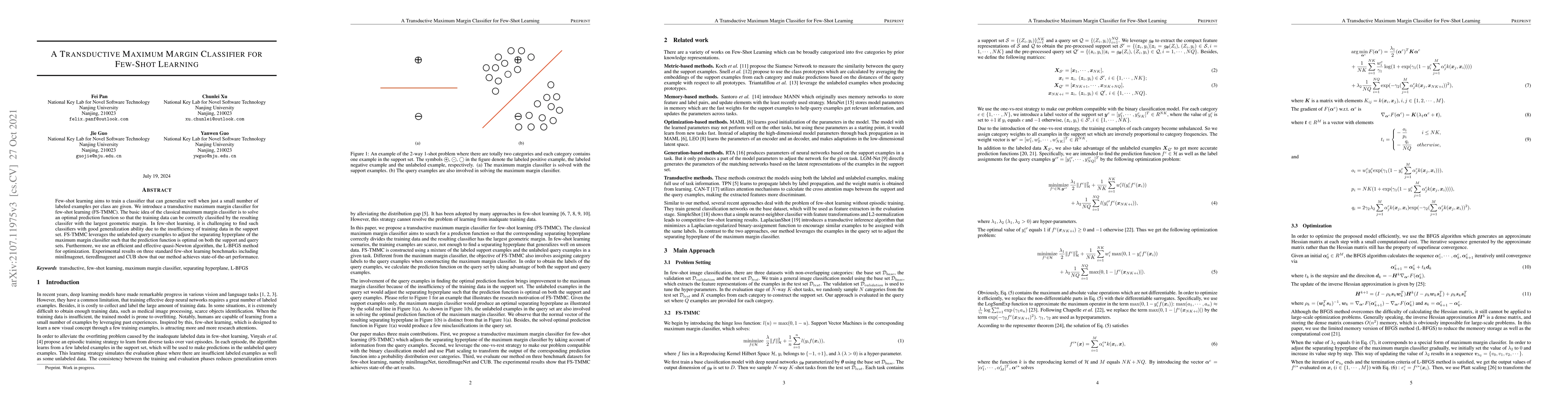 This paper proposes a transductive maximum margin classifier for few-shot learning that utilizes unlabeled query examples to enhance the separating hyperplane, achieving state-of-the-art performance on miniImagenet, tieredImagenet, and CUB benchmarks. The method employs the L-BFGS optimization algorithm for efficient training.