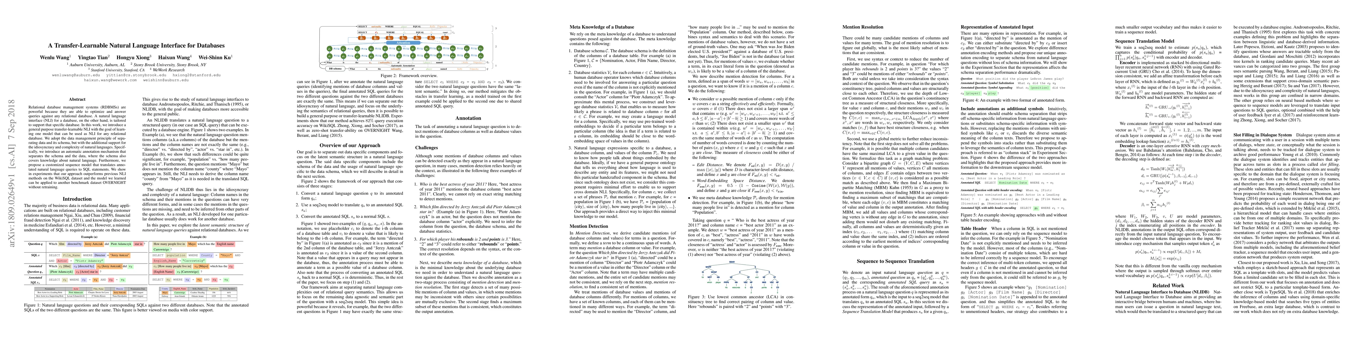 This paper presents a transfer-learnable natural language interface (NLI) for relational databases that aims to create a single model adaptable to any database. The model uses an automatic annotation mechanism to separate schema and data, and a customized sequence model to translate natural language queries into SQL, demonstrating superior performance on benchmark datasets.