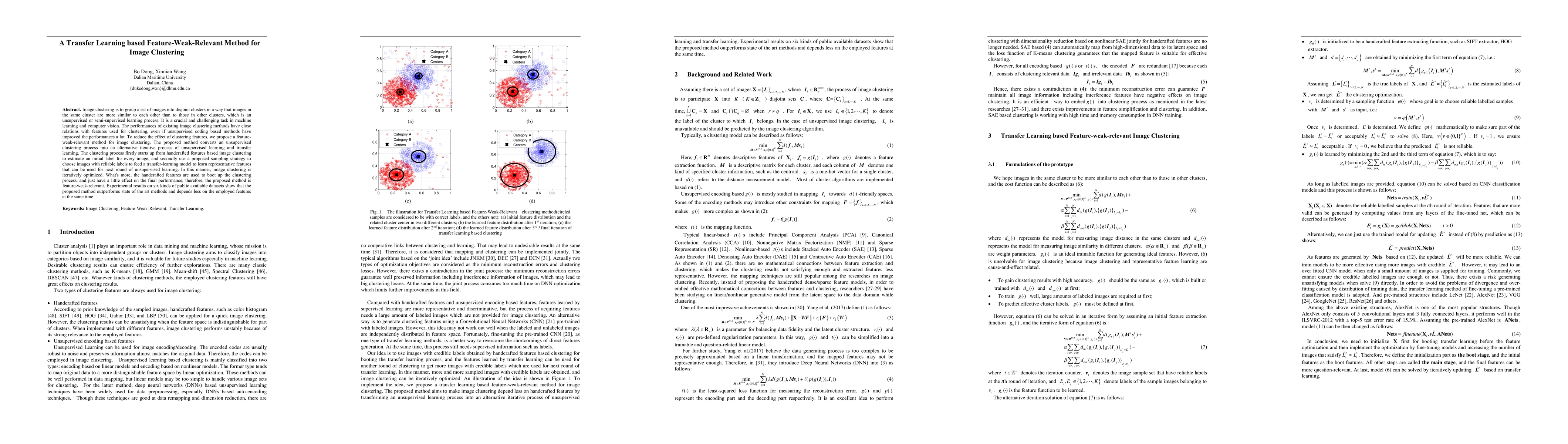 Image clustering is to group a set of images into disjoint clusters in a way that images in the same cluster are more similar to each other than to those in other clusters, which is an unsupervised or semi-supervised learning process. It is a crucial and challenging task in machine learning and computer vision. The performances of existing image clustering methods have close relations with features used for clustering, even if unsupervised coding based methods have improved the performances a lot. To reduce the effect of clustering features, we propose a feature-weak-relevant method for image clustering. The proposed method converts an unsupervised clustering process into an alternative iterative process of unsupervised learning and transfer learning. The clustering process firstly starts up from handcrafted features based image clustering to estimate an initial label for every image, and secondly use a proposed sampling strategy to choose images with reliable labels to feed a transfer-learning model to learn representative features that can be used for next round of unsupervised learning. In this manner, image clustering is iteratively optimized. What's more, the handcrafted features are used to boot up the clustering process, and just have a little effect on the final performance; therefore, the proposed method is feature-weak-relevant. Experimental results on six kinds of public available datasets show that the proposed method outperforms state of the art methods and depends less on the employed features at the same time.