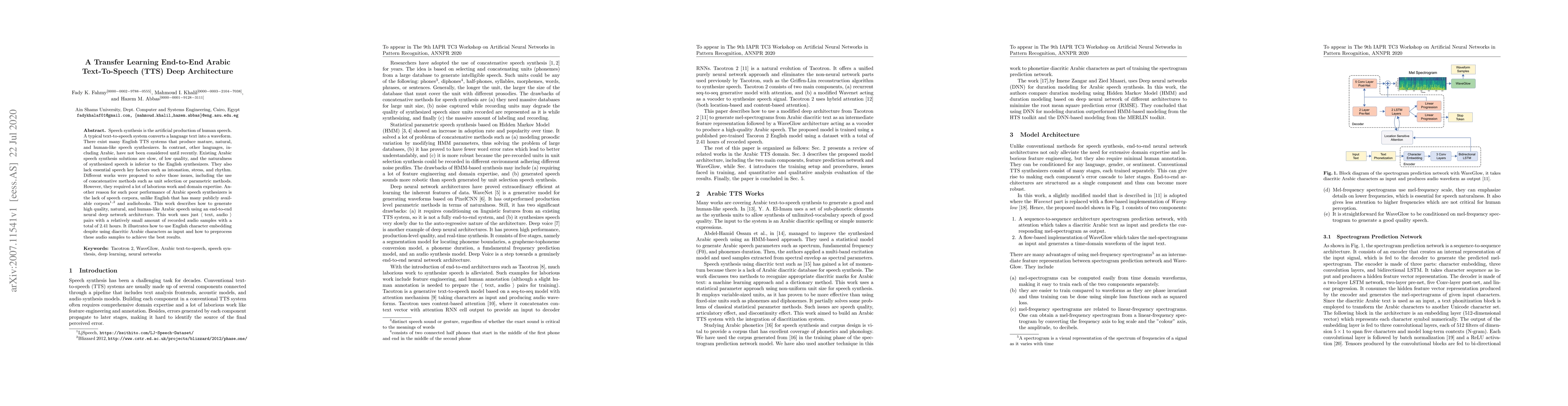This paper proposes a transfer learning-based end-to-end deep neural network architecture for generating high-quality Arabic Text-To-Speech (TTS) using minimal recorded audio samples. It leverages English character embeddings and preprocessing techniques to overcome the scarcity of Arabic speech corpora.
