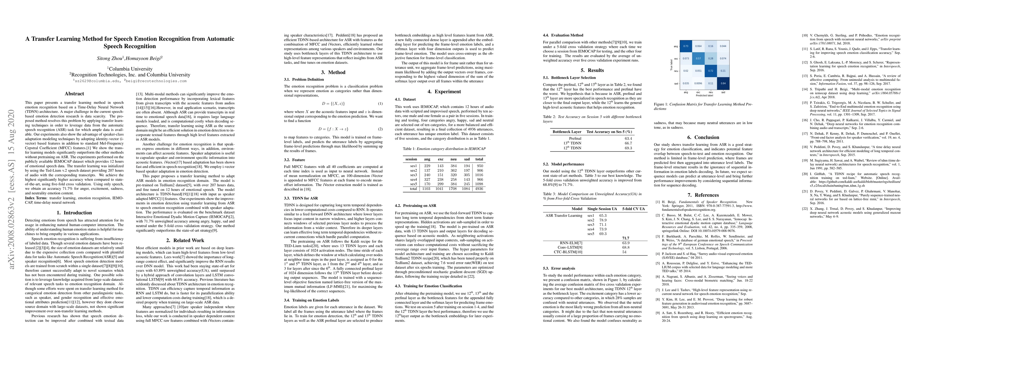 The paper introduces a TDNN-based transfer learning method for speech emotion recognition, utilizing i-vector features and ASR data for improved performance.