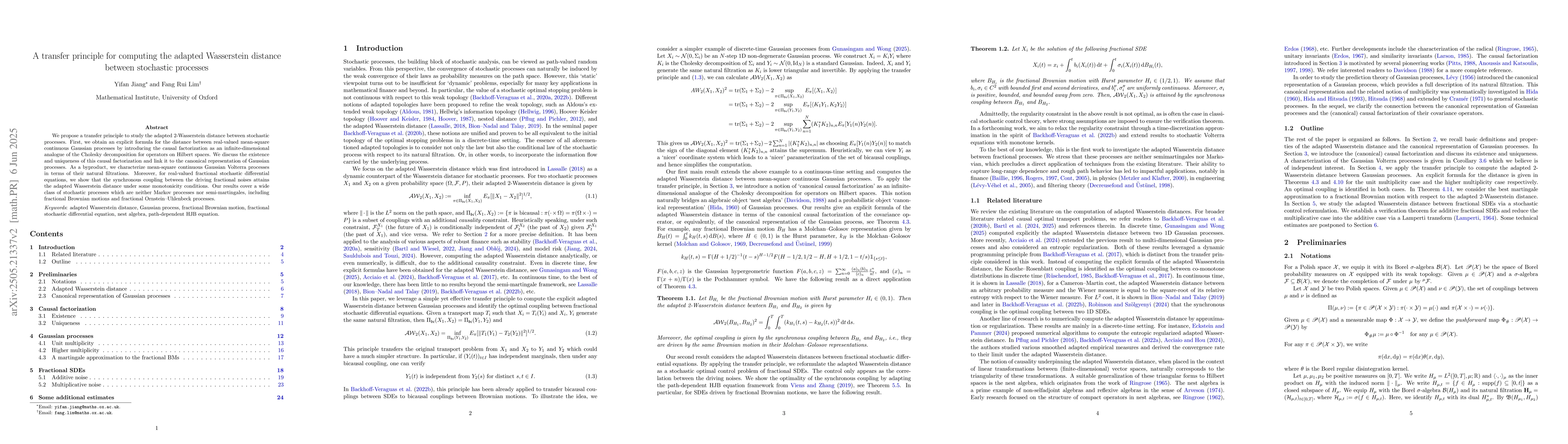 The paper presents a transfer principle and causal factorization approach for computing the adapted Wasserstein distance, offering an explicit formula for Gaussian processes and characterizing Volterra processes.