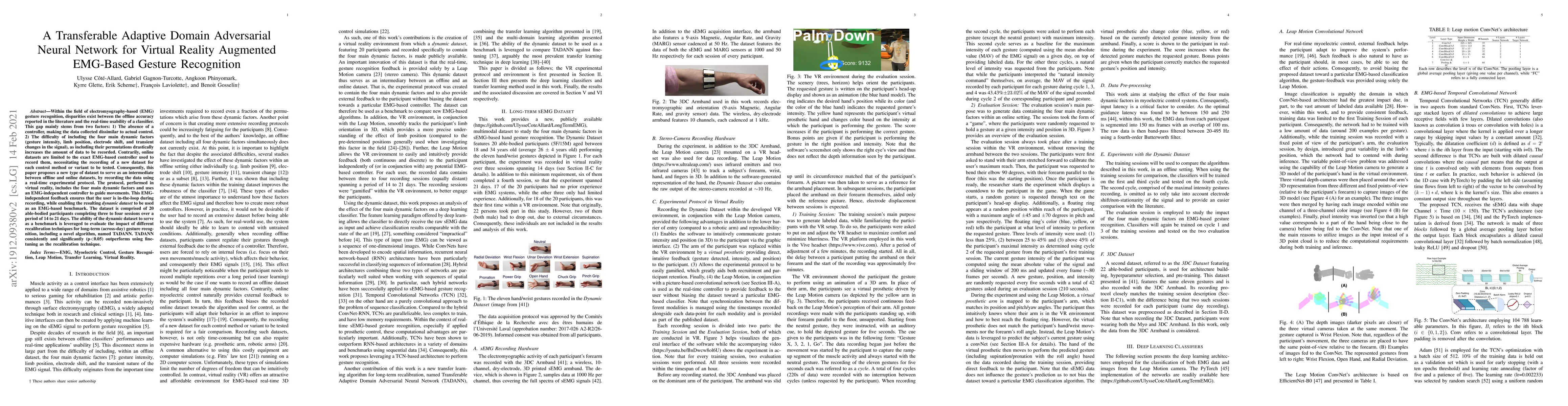 Within the field of electromyography-based (EMG) gesture recognition, disparities exist between the offline accuracy reported in the literature and the real-time usability of a classifier. This gap mainly stems from two factors: 1) The absence of a controller, making the data collected dissimilar to actual control. 2) The difficulty of including the four main dynamic factors (gesture intensity, limb position, electrode shift, and transient changes in the signal), as including their permutations drastically increases the amount of data to be recorded. Contrarily, online datasets are limited to the exact EMG-based controller used to record them, necessitating the recording of a new dataset for each control method or variant to be tested. Consequently, this paper proposes a new type of dataset to serve as an intermediate between offline and online datasets, by recording the data using a real-time experimental protocol. The protocol, performed in virtual reality, includes the four main dynamic factors and uses an EMG-independent controller to guide movements. This EMG-independent feedback ensures that the user is in-the-loop during recording, while enabling the resulting dynamic dataset to be used as an EMG-based benchmark. The dataset is comprised of 20 able-bodied participants completing three to four sessions over a period of 14 to 21 days. The ability of the dynamic dataset to serve as a benchmark is leveraged to evaluate the impact of different recalibration techniques for long-term (across-day) gesture recognition, including a novel algorithm, named TADANN. TADANN consistently and significantly (p<0.05) outperforms using fine-tuning as the recalibration technique.