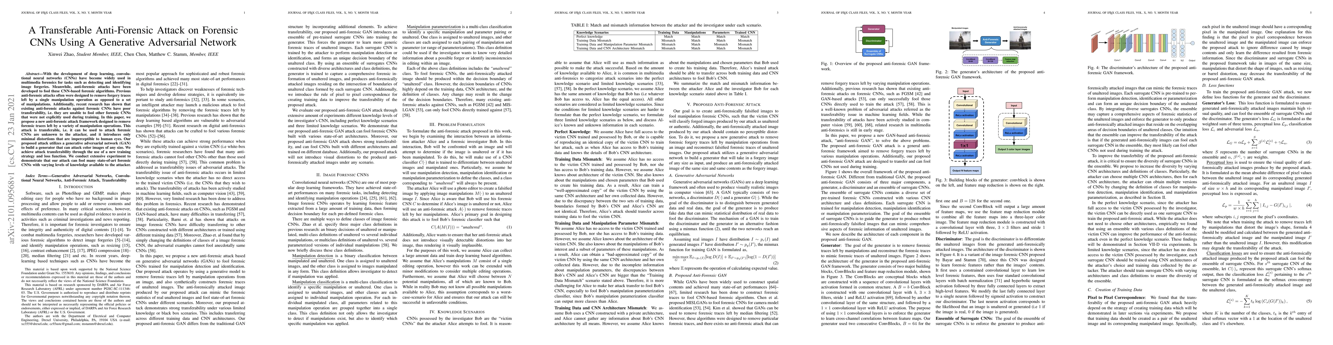 This paper proposes a transferable anti-forensic attack using a generative adversarial network (GAN) to remove traces of various image manipulations, achieving minimal perceptible distortions. The attack demonstrates high transferability, effectively fooling diverse forensic CNNs not used during its training.