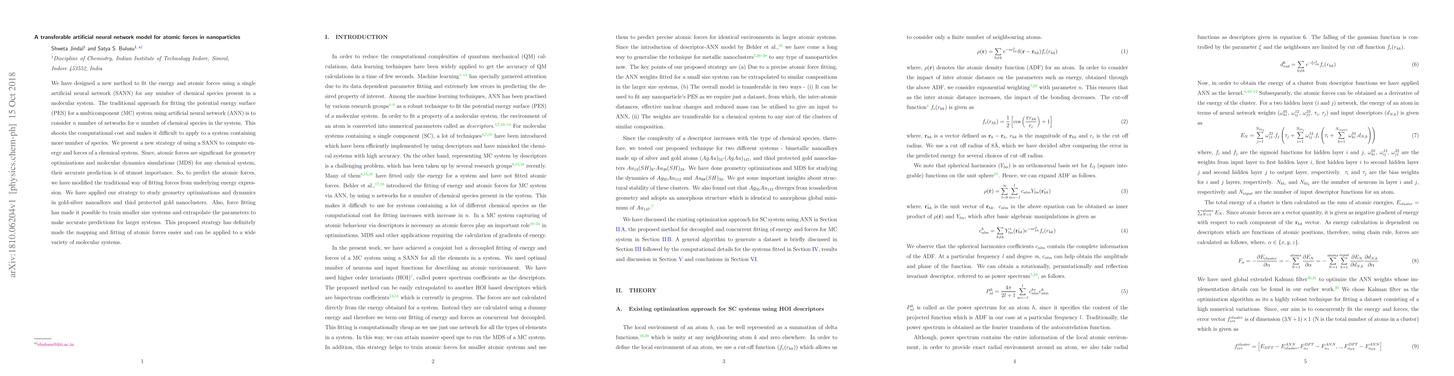 We have designed a new method to fit the energy and atomic forces using a single artificial neural network (SANN) for any number of chemical species present in a molecular system. The traditional approach for fitting the potential energy surface (PES) for a multicomponent (MC) system using artificial neural network (ANN) is to consider n number of networks for n number of chemical species in the system. This shoots the computational cost and makes it difficult to apply to a system containing more number of species. We present a new strategy of using a SANN to compute energy and forces of a chemical system. Since, atomic forces are significant for geometry optimizations and molecular dynamics simulations (MDS) for any chemical system, their accurate prediction is of utmost importance. So, to predict the atomic forces, we have modified the traditional way of fitting forces from underlying energy expression. We have applied our strategy to study geometry optimizations and dynamics in gold-silver nanoalloys and thiol protected gold nanoclusters. Also, force fitting has made it possible to train smaller size systems and extrapolate the parameters to make accurate predictions for larger systems. This proposed strategy has definitely made the mapping and fitting of atomic forces easier and can be applied to a wide variety of molecular systems.