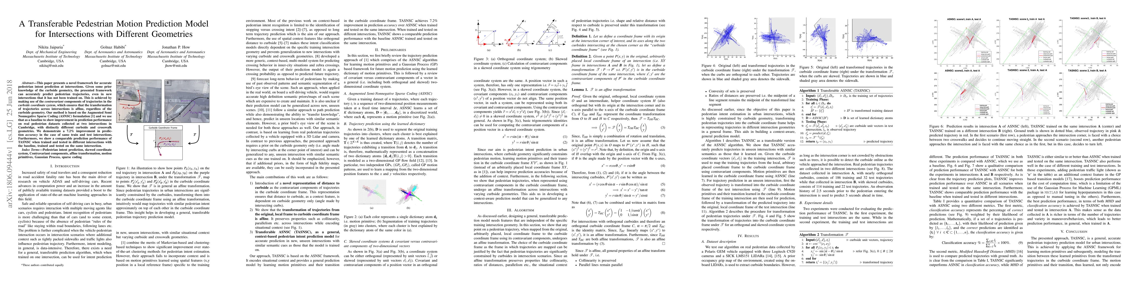 This paper presents a novel framework for accurate pedestrian intent prediction at intersections. Given some prior knowledge of the curbside geometry, the presented framework can accurately predict pedestrian trajectories, even in new intersections that it has not been trained on. This is achieved by making use of the contravariant components of trajectories in the curbside coordinate system, which ensures that the transformation of trajectories across intersections is affine, regardless of the curbside geometry. Our method is based on the Augmented Semi Nonnegative Sparse Coding (ASNSC) formulation and we use that as a baseline to show improvement in prediction performance on real pedestrian datasets collected at two intersections in Cambridge, with distinctly different curbside and crosswalk geometries. We demonstrate a 7.2% improvement in prediction accuracy in the case of same train and test intersections. Furthermore, we show a comparable prediction performance of TASNSC when trained and tested in different intersections with the baseline, trained and tested on the same intersection.