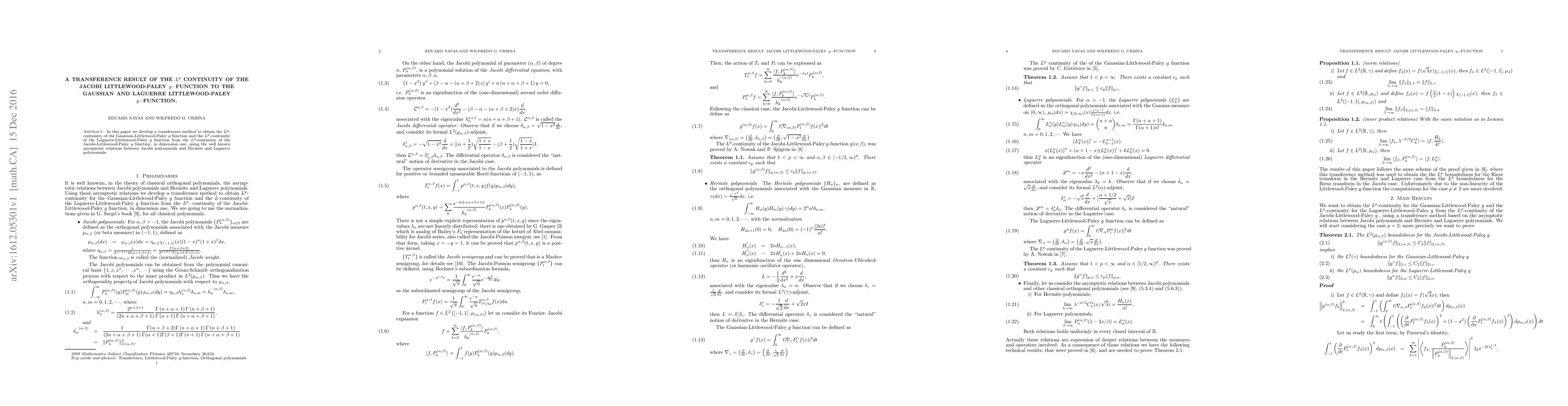 A transference result of the L^p continuity of the Jacobi Littlewood-Paley g-function to the Gaussian and Laguerre Littlewood-Paley g-function.