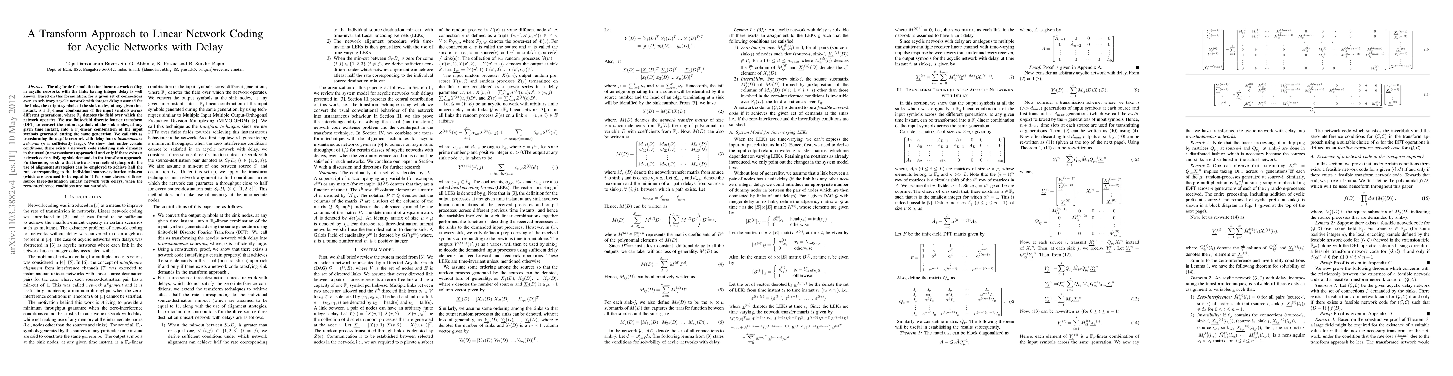 The algebraic formulation for linear network coding in acyclic networks with the links having integer delay is well known. Based on this formulation, for a given set of connections over an arbitrary acyclic network with integer delay assumed for the links, the output symbols at the sink nodes, at any given time instant, is a \mathbb{F}_{q}$-linear combination of the input symbols across different generations, where $\mathbb{F}_{q}$ denotes the field over which the network operates. We use finite-field discrete fourier transform (DFT) to convert the output symbols at the sink nodes, at any given time instant, into a $\mathbb{F}_{q}$-linear combination of the input symbols generated during the same generation. We call this as transforming the acyclic network with delay into {\em $n$-instantaneous networks} ($n$ is sufficiently large). We show that under certain conditions, there exists a network code satisfying sink demands in the usual (non-transform) approach if and only if there exists a network code satisfying sink demands in the transform approach. Furthermore, we show that the transform method (along with the use of alignment strategies) can be employed to achieve half the rate corresponding to the individual source-destination min-cut (which are assumed to be equal to 1) for some classes of three-source three-destination unicast network with delays, when the zero-interference conditions are not satisfied.