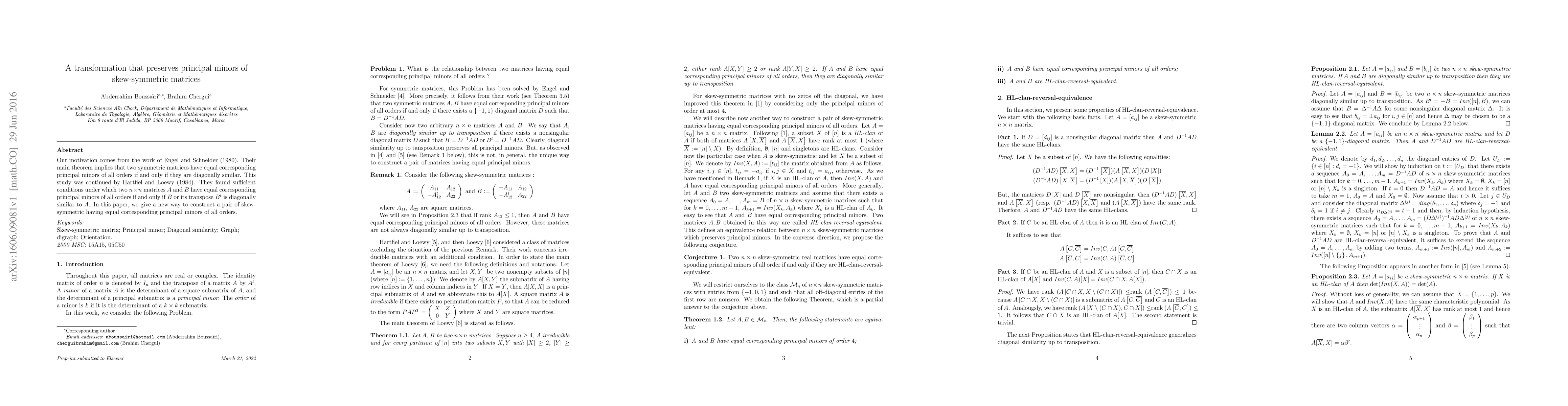 This paper introduces a novel method to construct pairs of skew-symmetric matrices that preserve equal corresponding principal minors of all orders, extending prior work by Engel, Schneider, Hartfiel, and Loewy on symmetric and diagonally similar matrices.