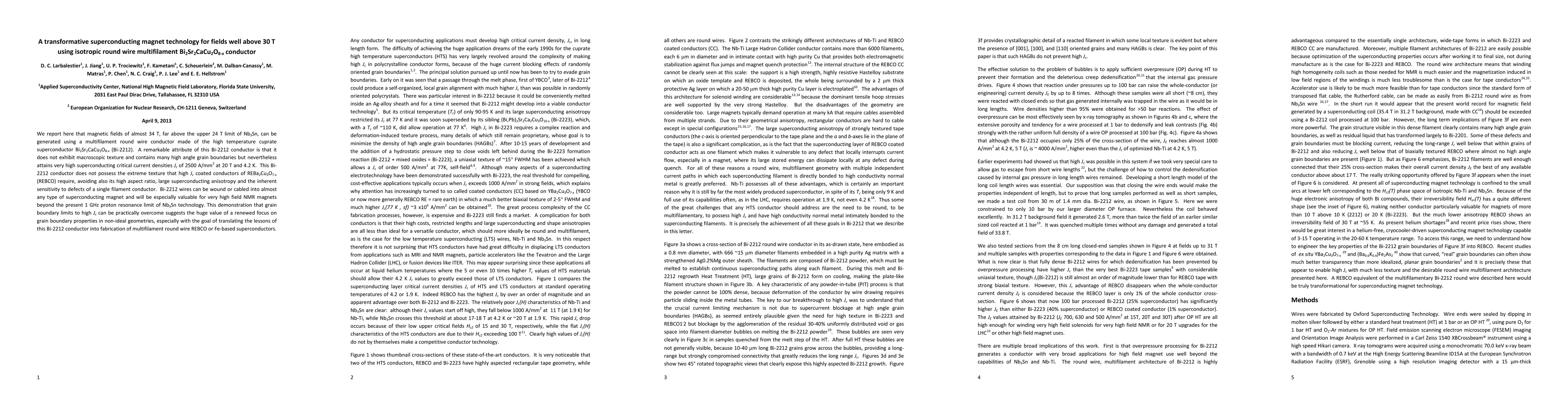 We report here that magnetic fields of almost 34 T, far above the upper 24 T limit of Nb3Sn, can be generated using a multifilament round wire conductor made of the high temperature cuprate superconductor Bi2Sr2CaCu2O8-x (Bi-2212). A remarkable attribute of this Bi-2212 conductor is that it does not exhibit macroscopic texture and contains many high angle grain boundaries but nevertheless attains very high superconducting critical current densities Jc of 2500 A/mm2 at 20 T and 4.2 K. This Bi-2212 conductor does not possess the extreme texture that high Jc coated conductors of REBa2Cu3O7-x (REBCO) require, avoiding also its high aspect ratio, large superconducting anisotropy and the inherent sensitivity to defects of a single filament conductor. Bi-2212 wires can be wound or cabled into almost any type of superconducting magnet and will be especially valuable for very high field NMR magnets beyond the present 1 GHz proton resonance limit of Nb3Sn technology. This demonstration that grain boundary limits to high Jc can be practically overcome suggests the huge value of a renewed focus on grain boundary properties in non-ideal geometries, especially with the goal of translating the lessons of this Bi-2212 conductor into fabrication of multifilament round wire REBCO or Fe-based superconductors.