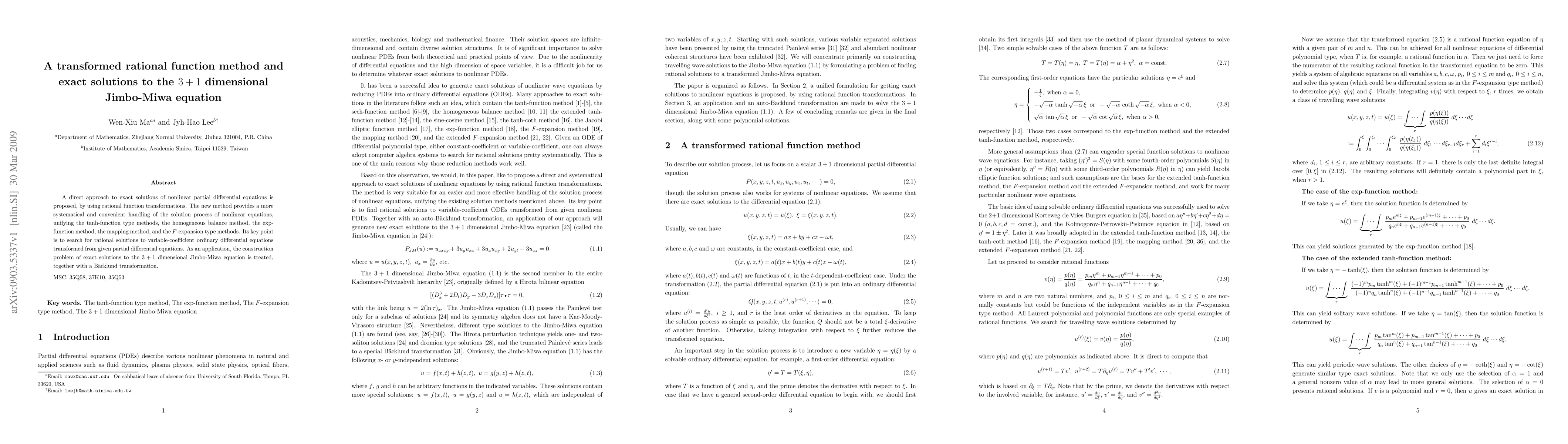 A direct approach to exact solutions of nonlinear partial differential equations is proposed, by using rational function transformations. The new method provides a more systematical and convenient handling of the solution process of nonlinear equations, unifying the tanh-function type methods, the homogeneous balance method, the exp-function method, the mapping method, and the F-expansion type methods. Its key point is to search for rational solutions to variable-coefficient ordinary differential equations transformed from given partial differential equations. As an application, the construction problem of exact solutions to the 3+1 dimensional Jimbo-Miwa equation is treated, together with a B\"acklund transformation.