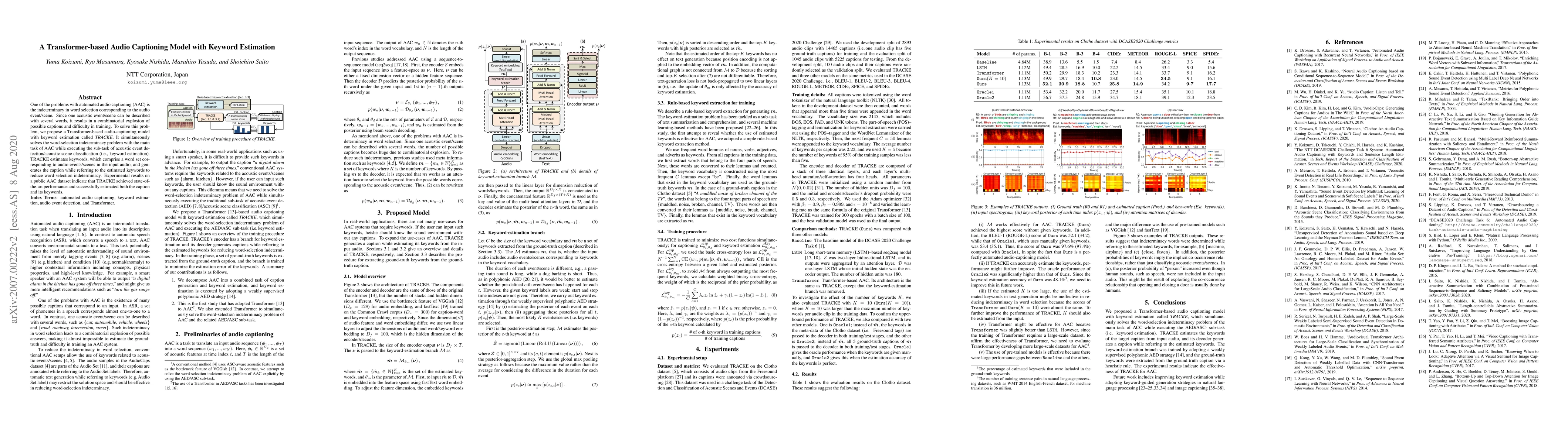 The paper proposes TRACKE, a Transformer-based model for audio captioning, which estimates keywords to address the indeterminacy in word selection for audio events. TRACKE simultaneously performs acoustic event detection and generates captions, achieving state-of-the-art performance on a public dataset.