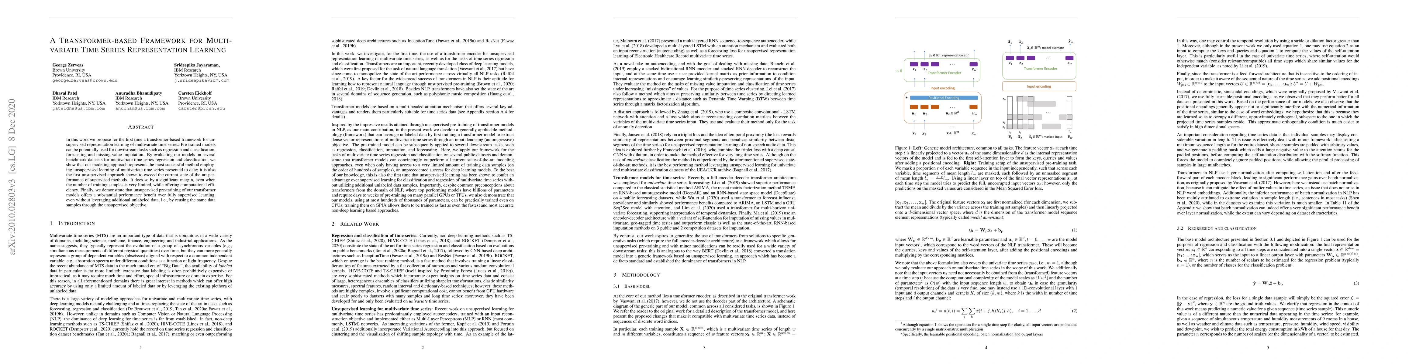 This research proposes a transformer-based framework for unsupervised representation learning of multivariate time series, outperforming existing supervised methods, especially with limited training data, while maintaining computational efficiency. The approach achieves state-of-the-art results in regression, classification, forecasting, and missing value imputation.
