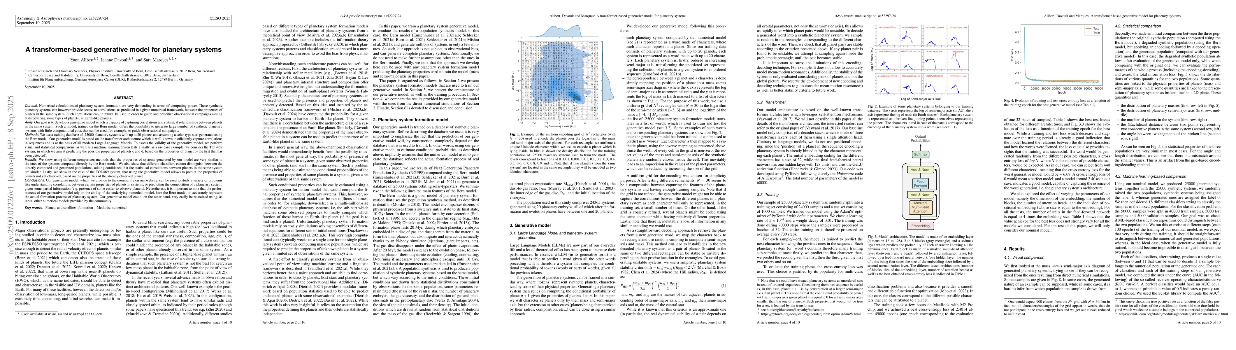 Numerical calculations of planetary system formation are very demanding in terms of computing power. These synthetic planetary systems can however provide access to correlations, as predicted in a given numerical framework, between the properties of planets in the same system. Such correlations can, in return, be used in order to guide and prioritize observational campaigns aiming at discovering some types of planets, as Earth-like planets. Our goal is to develop a generative model which is capable of capturing correlations and statistical relationships between planets in the same system. Such a model, trained on the Bern model, offers the possibility to generate large number of synthetic planetary systems with little computational cost, that can be used, for example, to guide observational campaigns. Our generative model is based on the transformer architecture which is well-known to efficiently capture correlations in sequences and is at the basis of all modern Large Language Models. To assess the validity of the generative model, we perform visual and statistical comparisons, as well as a machine learning driven tests. Finally, as a use case example, we consider the TOI-469 system, in which we aim at predicting the possible properties of planets c and d, based on the properties of planet b (the first that has been detected). We show using different comparison methods that the properties of systems generated by our model are very similar to the ones of the systems computed directly by the Bern model. We also show in the case of the TOI-469 system, that using the generative model allows to predict the properties of planets not yet observed, based on the properties of the already observed planet. We provide our model to the community on our website www.ai4exoplanets.com.