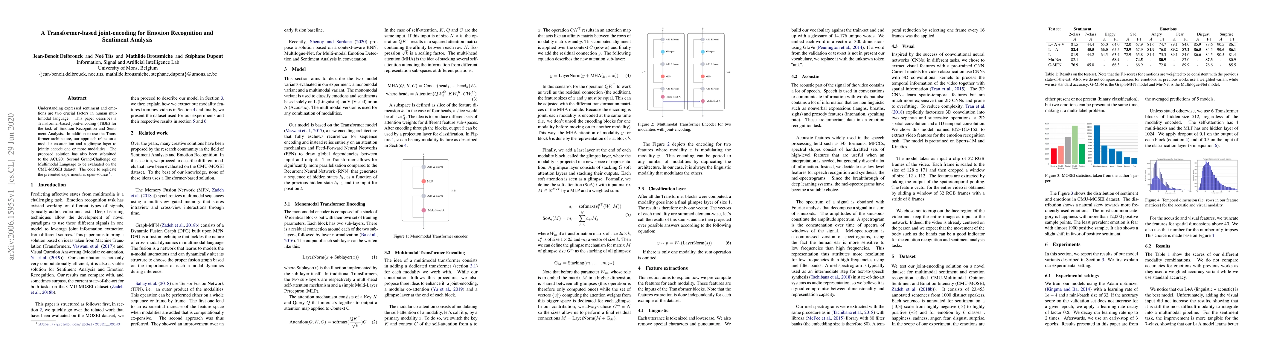 This paper proposes a Transformer-based joint-encoding (TBJE) for Emotion Recognition and Sentiment Analysis using modular co-attention and a glimpse layer to jointly encode multimodal inputs. The approach is open-source and evaluated in the ACL20: Second Grand-Challenge on Multimodal Language using the CMU-MOSEI dataset.