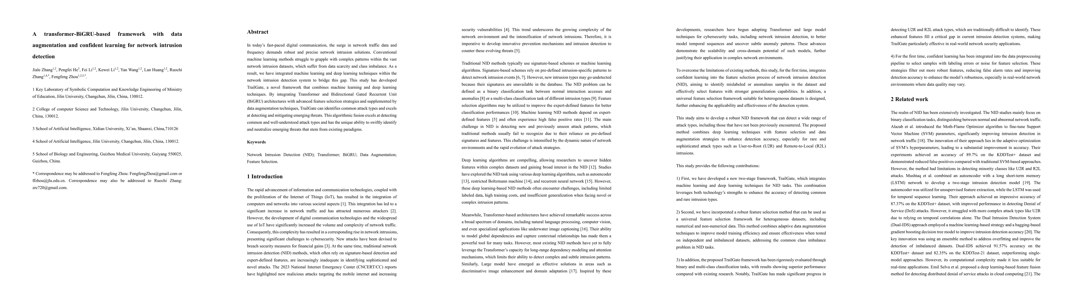 In today's fast-paced digital communication, the surge in network traffic data and frequency demands robust and precise network intrusion solutions. Conventional machine learning methods struggle to grapple with complex patterns within the vast network intrusion datasets, which suffer from data scarcity and class imbalance. As a result, we have integrated machine learning and deep learning techniques within the network intrusion detection system to bridge this gap. This study has developed TrailGate, a novel framework that combines machine learning and deep learning techniques. By integrating Transformer and Bidirectional Gated Recurrent Unit (BiGRU) architectures with advanced feature selection strategies and supplemented by data augmentation techniques, TrailGate can identifies common attack types and excels at detecting and mitigating emerging threats. This algorithmic fusion excels at detecting common and well-understood attack types and has the unique ability to swiftly identify and neutralize emerging threats that stem from existing paradigms.