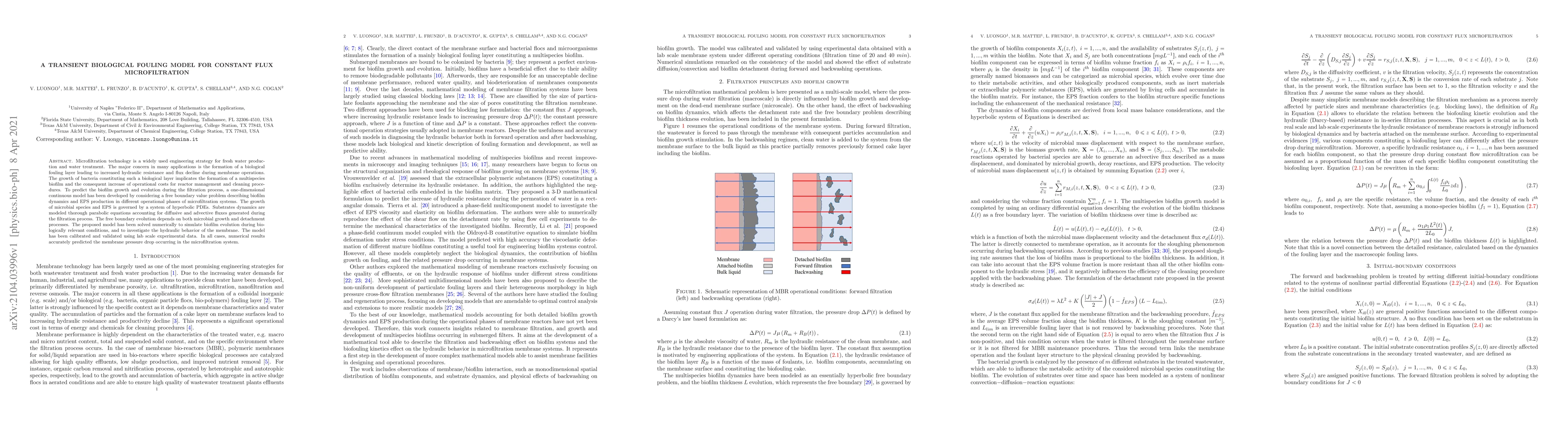 This paper develops a transient biological fouling model for constant flux microfiltration, focusing on predicting biofilm growth and evolution through a one-dimensional continuous model governed by hyperbolic PDEs and parabolic equations. The model accurately predicts membrane pressure drop, validated by lab-scale experimental data.