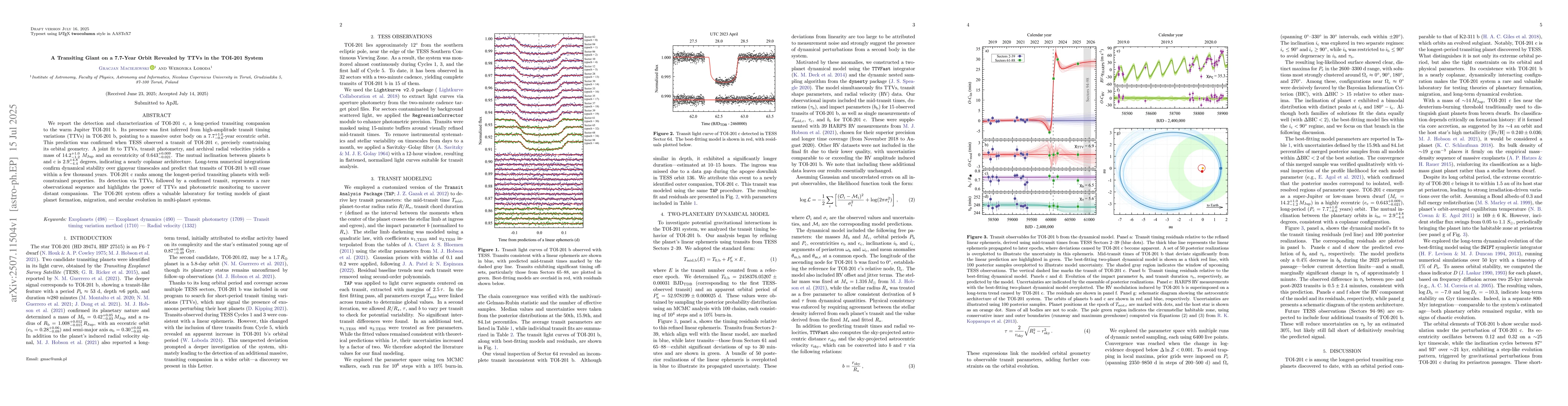We report the detection and characterization of TOI-201 c, a long-period transiting companion to the warm Jupiter TOI-201 b. Its presence was first inferred from high-amplitude transit timing variations (TTVs) in TOI-201 b, pointing to a massive outer body on a $7.7^{+1.0}_{-0.6}$-year eccentric orbit. This prediction was confirmed when TESS observed a transit of TOI-201 c, precisely constraining its orbital geometry. A joint fit to TTVs, transit photometry, and archival radial velocities yields a mass of $14.2^{+1.0}_{-1.2}$ $M_{\rm Jup}$ and an eccentricity of $0.643^{+0.009}_{-0.021}$. The mutual inclination between planets b and c is $2.9^{+4.8}_{-4.4}$ degrees, indicating a nearly coplanar architecture. Long-term numerical integrations confirm dynamical stability over gigayear timescales and predict that transits of TOI-201 b will cease within a few thousand years. TOI-201 c ranks among the longest-period transiting planets with well-constrained properties. Its detection via TTVs, followed by a confirmed transit, represents a rare observational sequence and highlights the power of TTVs and photometric monitoring to uncover distant companions. The TOI-201 system offers a valuable laboratory for testing models of giant planet formation, migration, and secular evolution in multi-planet systems.
