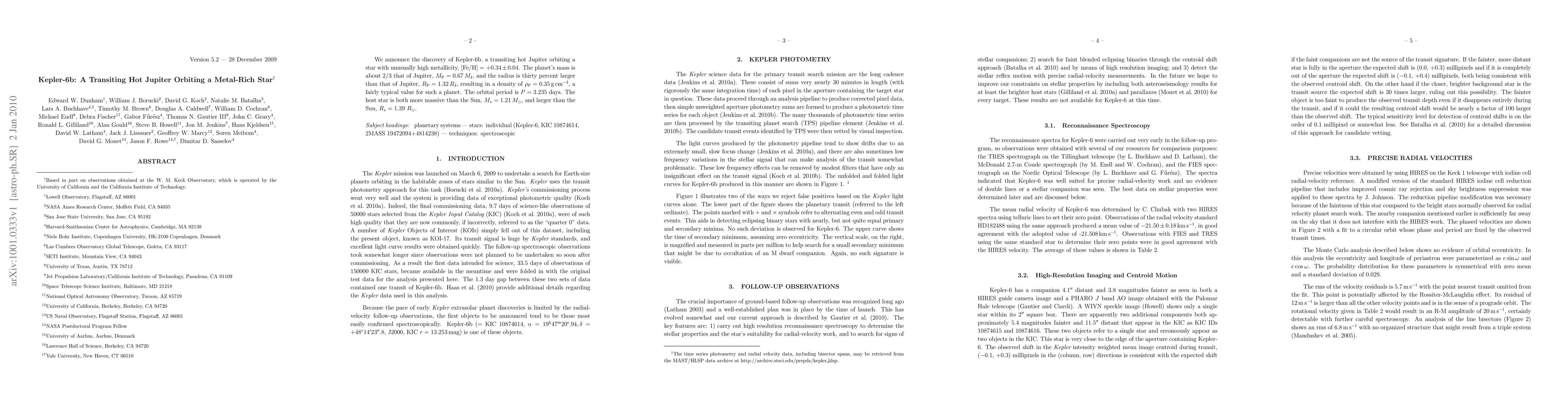 Summary: Kepler-6b, a transiting hot Jupiter with a mass of 0.67 Mj and a radius of 1.32 Rj, orbits a metal-rich star with high metallicity [Fe/H] = +0.34 +/- 0.04, completing an orbit every 3.235 days. The star is more massive and larger than the Sun.