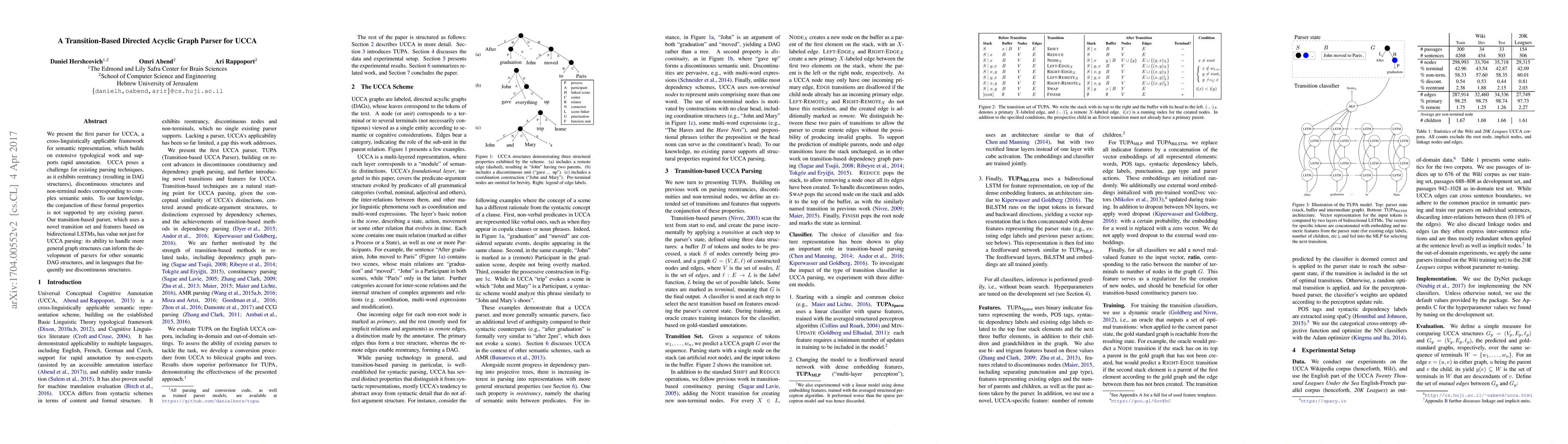 This paper introduces a novel transition-based directed acyclic graph (DAG) parser for UCCA, a framework for cross-linguistic semantic representation. The parser addresses the unique challenges of UCCA's reentrant, discontinuous structures, and complex semantic units, offering broader implications for parsing other semantic DAGs and languages with discontinuous syntax.
