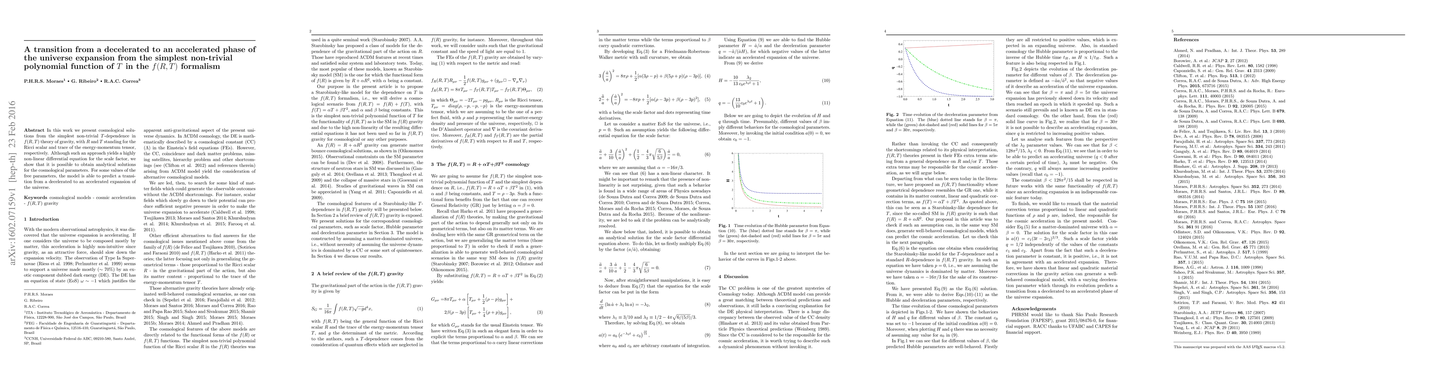 In this work we present cosmological solutions from the simplest non-trivial $T$-dependence in $f(R,T)$ theory of gravity, with $R$ and $T$ standing for the Ricci scalar and trace of the energy-momentum tensor, respectively. Although such an approach yields a highly non-linear differential equation for the scale factor, we show that it is possible to obtain analytical solutions for the cosmological parameters. For some values of the free parameters, the model is able to predict a transition from a decelerated to an accelerated expansion of the universe.