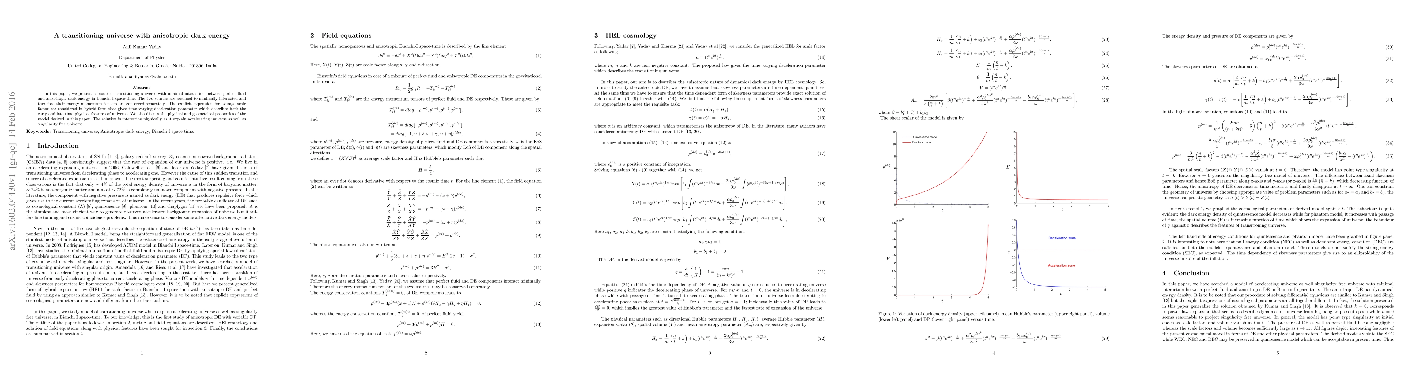 In this paper, we present a model of transitioning universe with minimal interaction between perfect fluid and anisotropic dark energy in Bianchi I space-time. The two sources are assumed to minimally interacted and therefore their energy momentum tensors are conserved separately. The explicit expression for average scale factor are considered in hybrid form that gives time varying deceleration parameter which describes both the early and late time physical features of universe. We also discuss the physical and geometrical properties of the model derived in this paper. The solution is interesting physically as it explain accelerating universe as well as singularity free universe.