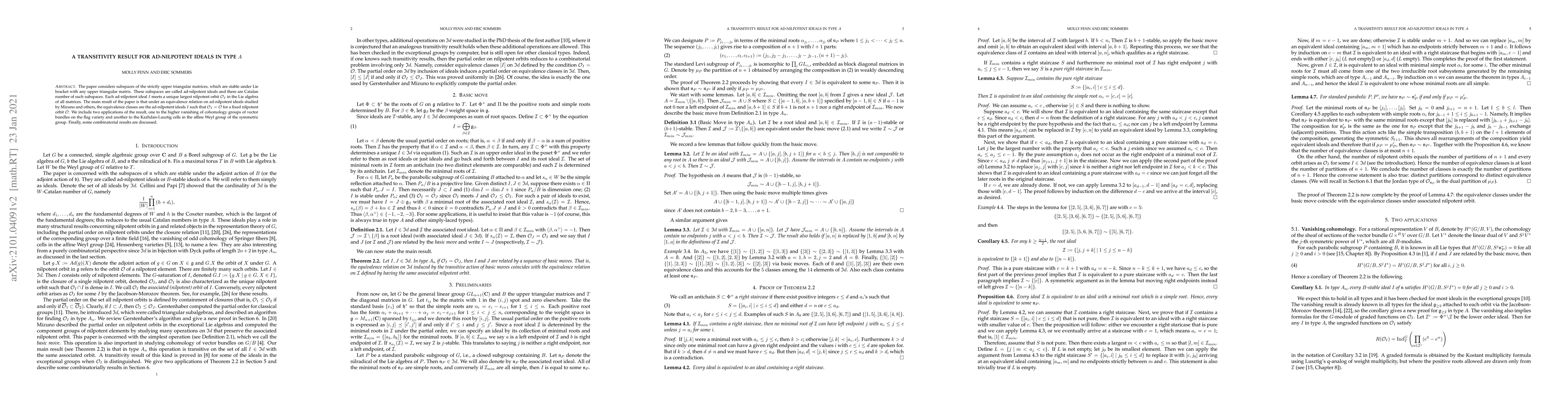 The paper establishes a transitivity result for ad-nilpotent ideals in type A, showing that under a specific equivalence relation, these ideals correspond to their largest nilpotent orbits. Applications include higher vanishing of cohomology groups and insights into Kazhdan-Lusztig cells.