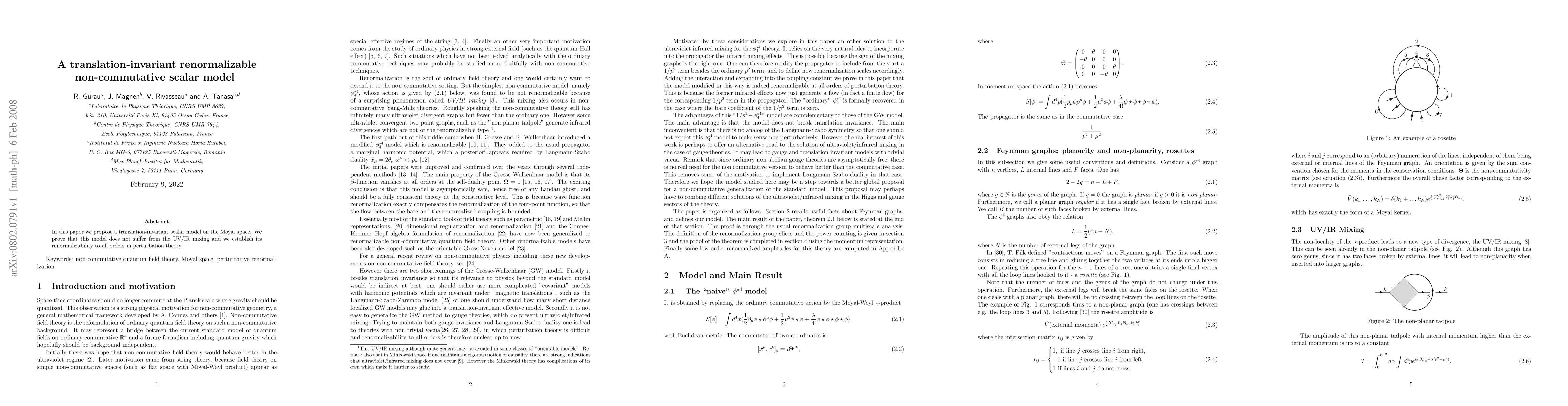 In this paper we propose a translation-invariant scalar model on the Moyal space. We prove that this model does not suffer from the UV/IR mixing and we establish its renormalizability to all orders in perturbation theory.