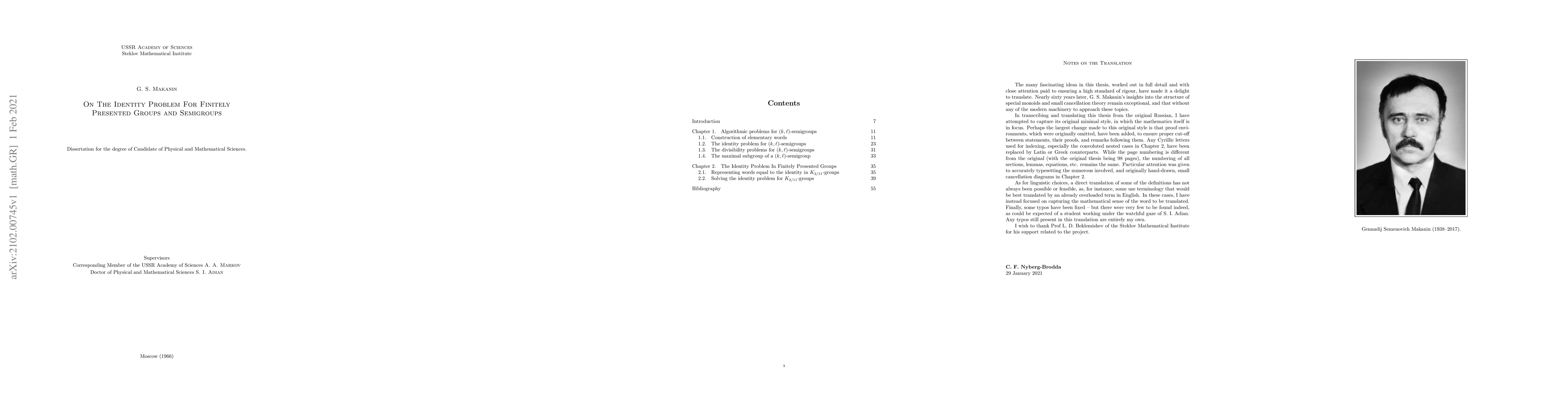 G. S. Makanin's 1966 Ph.D. thesis explores solutions to the identity problem for finitely presented groups and semigroups, a fundamental concept in abstract algebra.