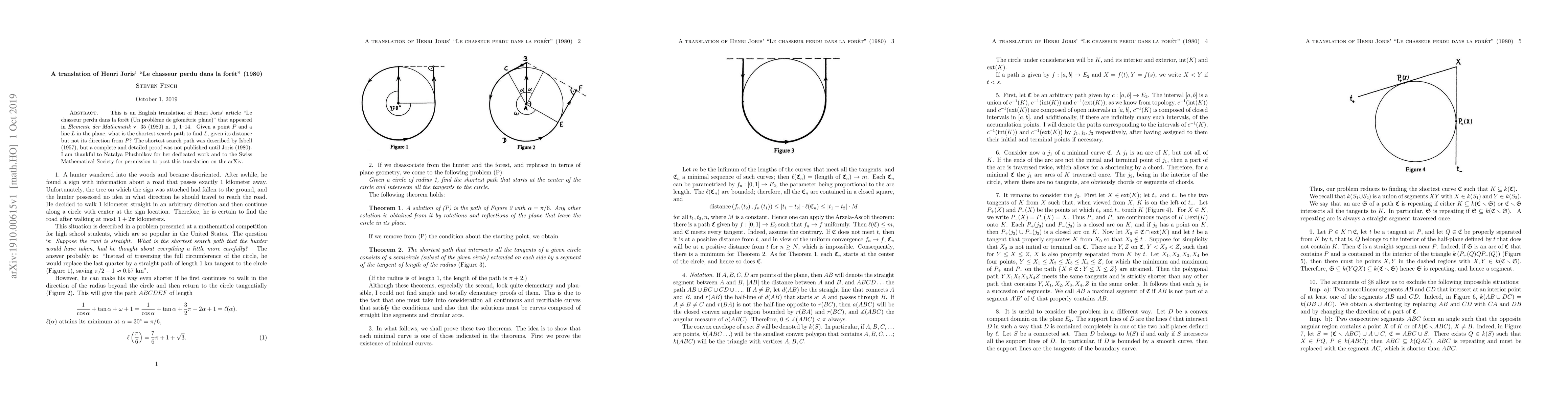 This is an English translation of Henri Joris' article "Le chasseur perdu dans la for\^et (Un probl\`eme de g\'eom\'etrie plane)" that appeared in $Elemente\ der\ Mathematik$ v. 35 (1980) n. 1, 1--14. Given a point $P$ and a line $L$ in the plane, what is the shortest search path to find $L$, given its distance but not its direction from $P$? The shortest search path was described by Isbell (1957), but a complete and detailed proof was not published until Joris (1980). I am thankful to Natalya Pluzhnikov for her dedicated work and to the Swiss Mathematical Society for permission to post this translation on the arXiv.
