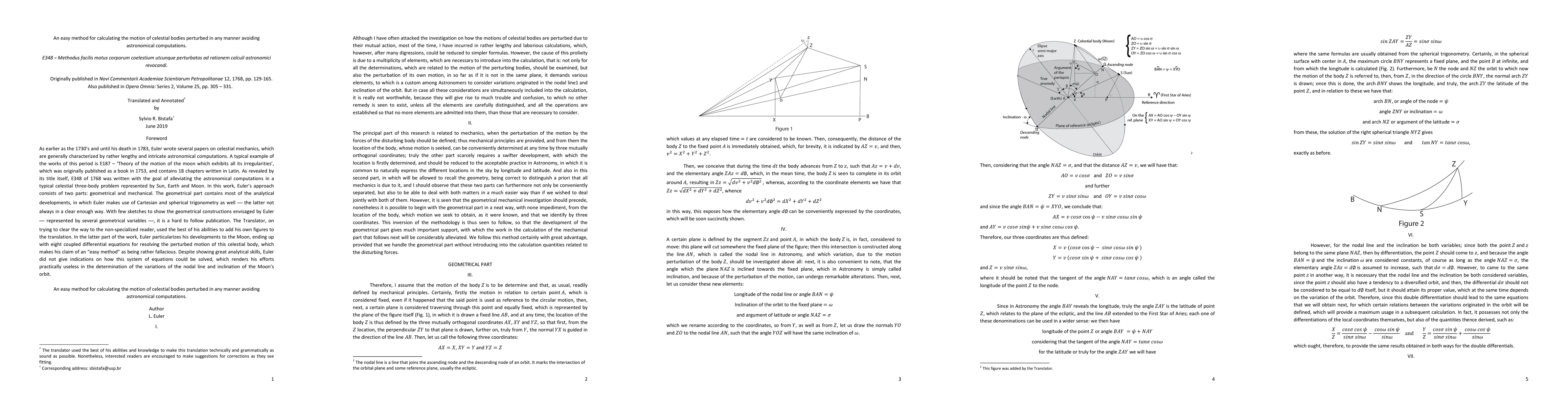This paper translates Euler's "Methodus facilis" which presents a method to simplify astronomical computations in celestial three-body problems, notably involving the Sun, Earth, and Moon. Despite Euler's analytical prowess, the translation highlights the impracticality of his proposed "easy method" due to the complexity of the resulting differential equations.