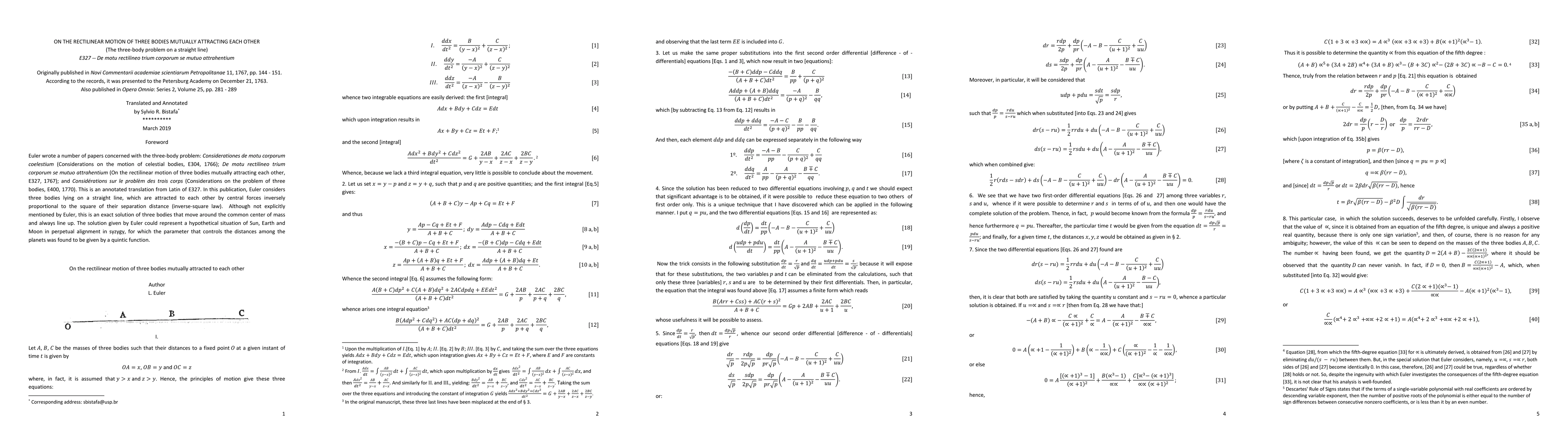 This annotated translation of Euler's Latin work "De motu rectilineo trium corporum se mutuo attrahentium" presents an exact solution for three bodies on a straight line, attracted by inverse-square law forces, potentially modeling a perpetual syzygy of Sun, Earth, and Moon, with distances governed by a quintic function.