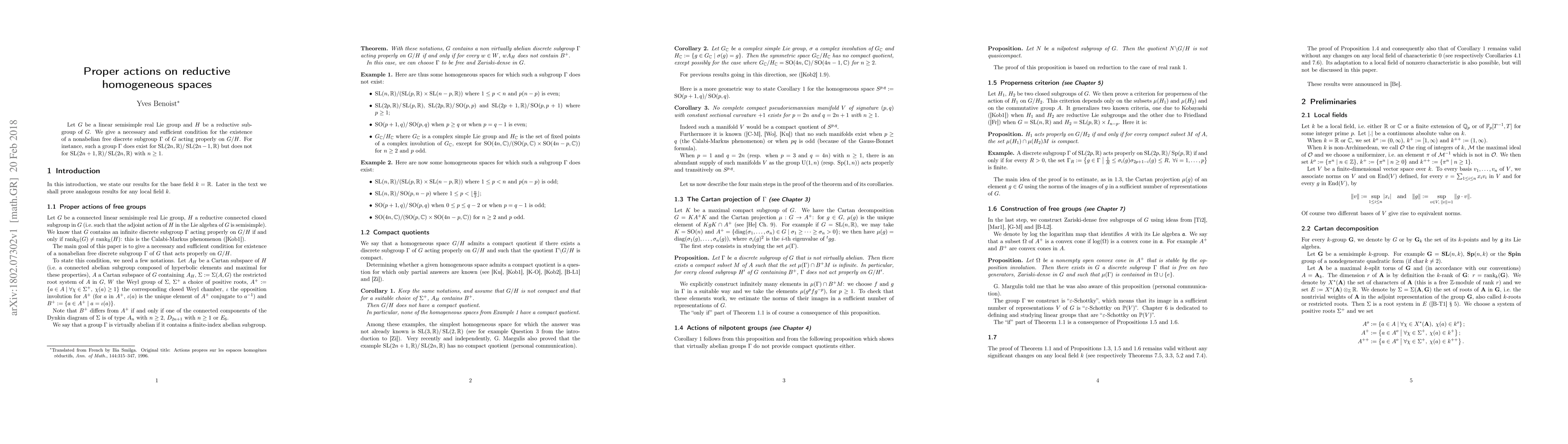 This paper translates Yves Benoist's original French work on proper actions on reductive homogeneous spaces, initially published in Annals of Mathematics, providing an English version for a broader audience. The study delves into the geometric and algebraic properties of such actions.