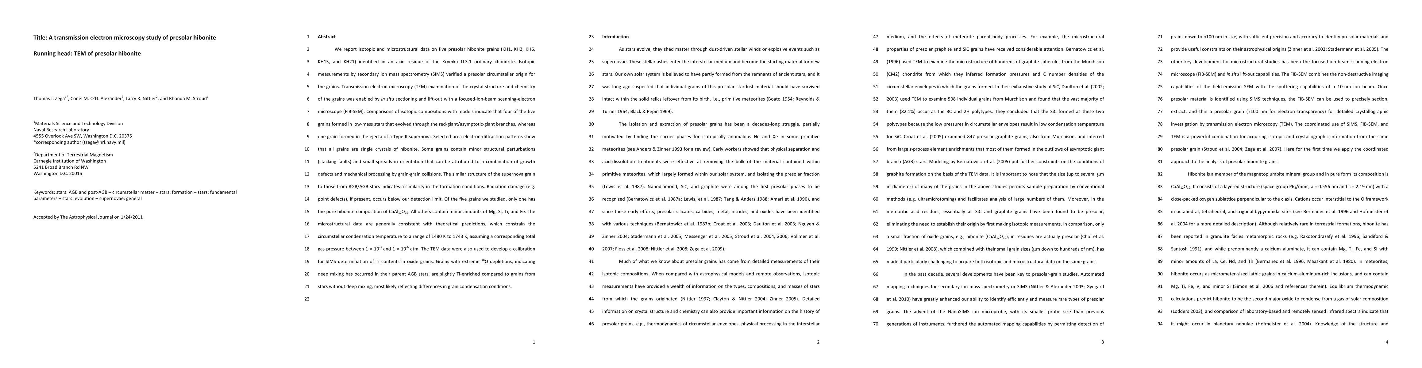 We report isotopic and microstructural data on five presolar hibonite grains identified in an acid residue of the Krymka LL3.1 ordinary chondrite. Isotopic measurements by secondary ion mass spectrometry (SIMS) verified a presolar circumstellar origin for the grains. Transmission electron microscopy (TEM) examination of the crystal structure and chemistry of the grains was enabled by in situ sectioning and lift-out with a focused-ion-beam scanning-electron microscope. Comparisons of isotopic compositions with models indicate that four of the five grains formed in low-mass stars that evolved through the red-giant/asymptotic-giant branches, whereas one grain formed in the ejecta of a Type II supernova. Selected-area electron-diffraction patterns show that all grains are single crystals of hibonite. Some grains contain stacking faults and small spreads in orientation that can be attributed to a combination of growth defects and mechanical processing by grain-grain collisions. The similar structure of the supernova grain to those from RGB/AGB stars indicates a similarity in the formation conditions. Radiation damage, if present, occurs below our detection limit. Of the five grains we studied, only one has the pure hibonite composition of CaAl12O19. All others contain minor amounts of Mg, Si, Ti, and Fe. The microstructural data are generally consistent with theoretical predictions, which constrain the circumstellar condensation temperature to a range of 1480 K to 1743 K, assuming a corresponding total gas pressure between 1 x 10-3 and 1 x 10-6 atm. The TEM data were used to develop a calibration for SIMS determination of Ti contents in oxide grains. Grains with extreme 18O depletions, indicating deep mixing has occurred in their parent AGB stars, are slightly Ti-enriched compared to grains from stars without deep mixing, most likely reflecting differences in grain condensation conditions.
