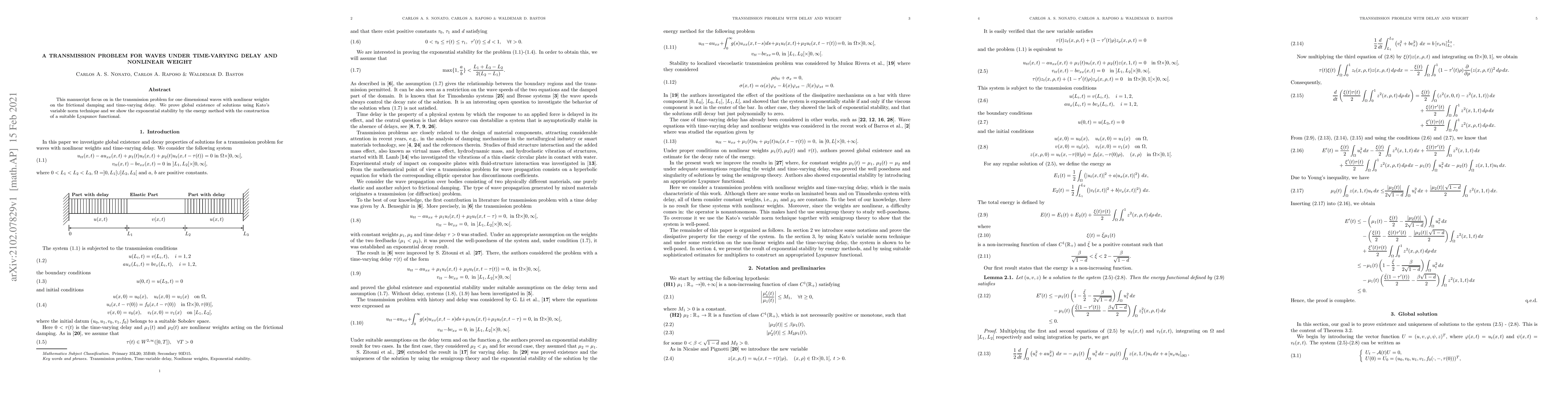 This manuscript focus on in the transmission problem for one dimensional waves with nonlinear weights on the frictional damping and time-varying delay. We prove global existence of solutions using Kato's variable norm technique and we show the exponential stability by the energy method with the construction of a suitable Lyapunov functional.