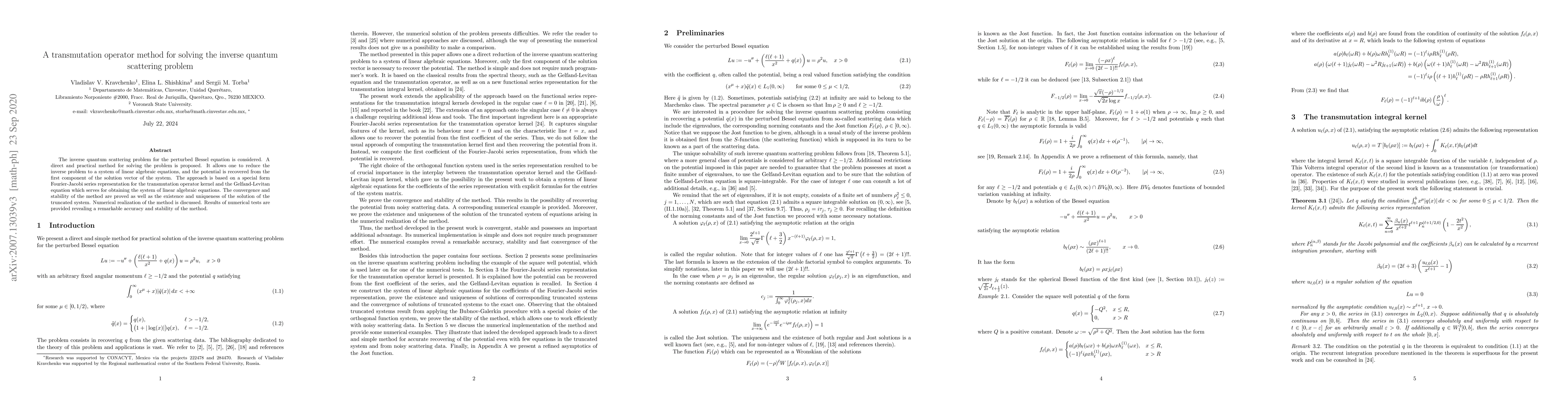 This paper proposes a transmutation operator method to solve the inverse quantum scattering problem for the perturbed Bessel equation, reducing it to a system of linear algebraic equations. The method is shown to be convergent, stable, and accurate, as demonstrated by numerical tests.