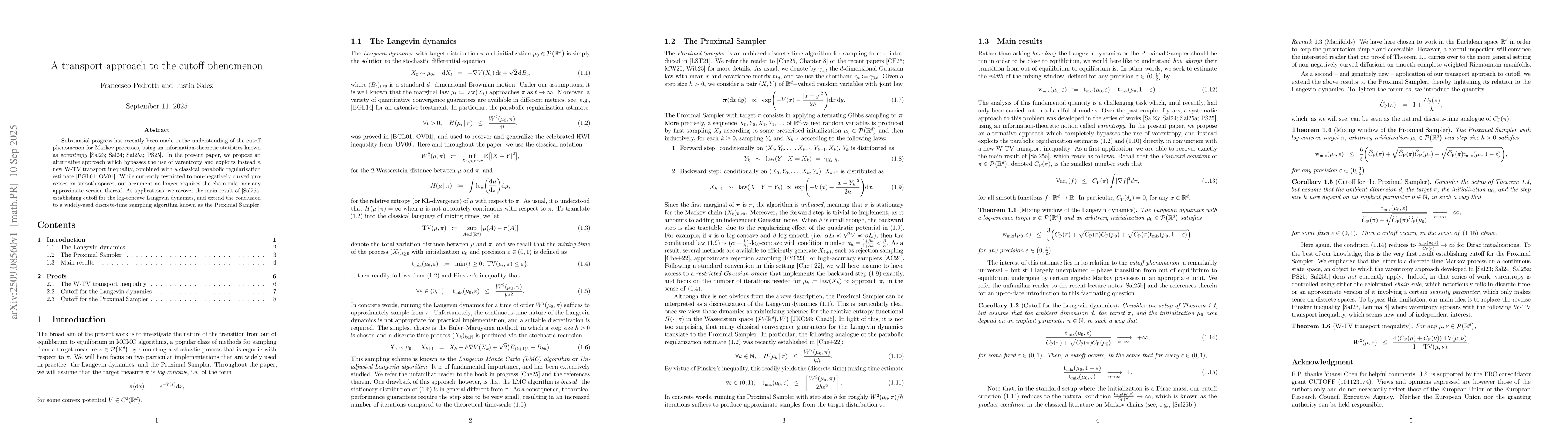 Substantial progress has recently been made in the understanding of the cutoff phenomenon for Markov processes, using an information-theoretic statistics known as varentropy [Sal23; Sal24; Sal25a; PS25]. In the present paper, we propose an alternative approach which bypasses the use of varentropy and exploits instead a new W-TV transport inequality, combined with a classical parabolic regularization estimate [BGL01; OV01]. While currently restricted to non-negatively curved processes on smooth spaces, our argument no longer requires the chain rule, nor any approximate version thereof. As applications, we recover the main result of [Sal25a] establishing cutoff for the log-concave Langevin dynamics, and extend the conclusion to a widely-used discrete-time sampling algorithm known as the Proximal Sampler.